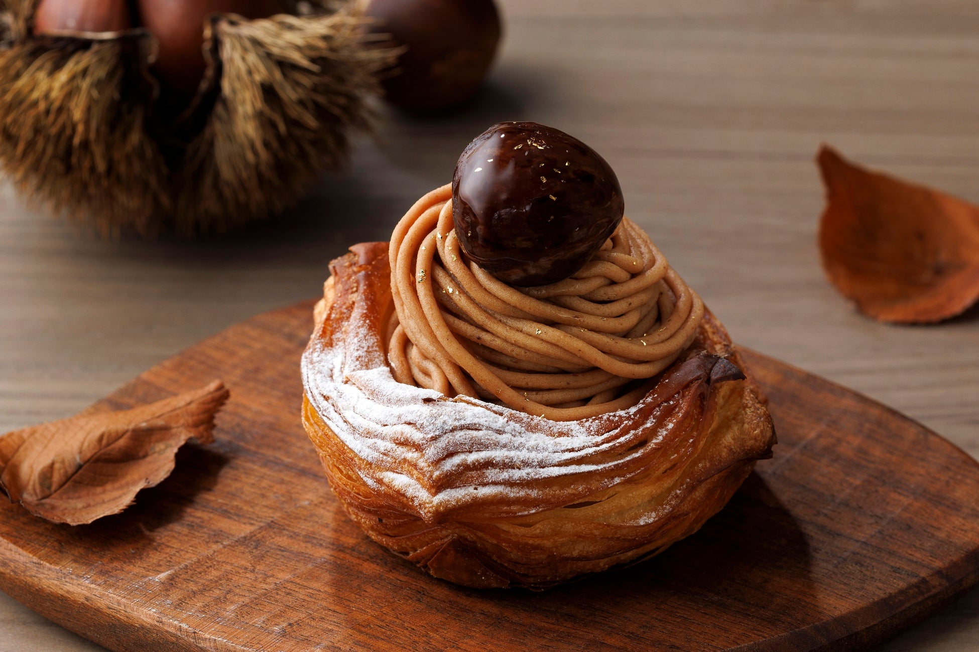 幾重にも薄く重ねたバターが香るサクサクのデニッシュ生地に、モンブランケーキのように濃厚でこっくりした甘さのマロンクリームを絞りました。アクセントに大きな渋皮栗をトッピングしています。