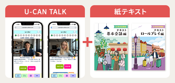 当講座はわかりやすい紙のテキスト付きなので、「英会話は初心者レベル。英語で答えられないかも……」といった方も安心です。テキストで学んでから「U-CAN TALK」のAI講師とレッスンすることで、日常から、旅行、ビジネスまで幅広く役立つ英会話力を効率良く養成します。