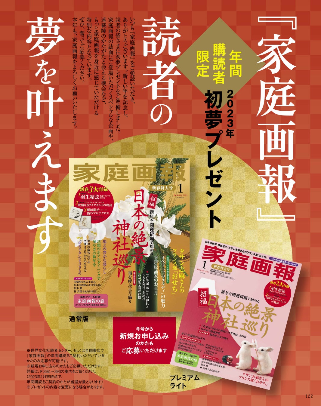 世界文化社が刊行する『家庭画報』では、新規で年間購読をお申込みいただいた方、既に年間購読をしていただいている方の中から、『家庭画報』のスペシャルな企画が当たる初夢プレゼントキャンペーンを開催します。