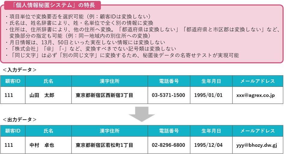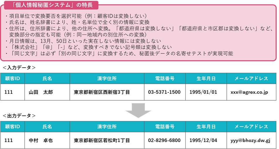「個人情報秘匿システム」は、構造化された個人情報データを秘匿化し、架空のデータに変換するシステムです。アグレックス独自の姓名辞書・住所辞書を搭載しており、個人情報の属性を維持したまま、「漢字→漢字」「かな→かな」「数字→数字」といったように文字の種類を保持して変換することが可能となります。