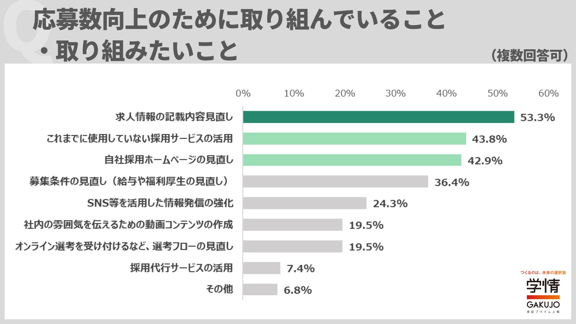応募数向上のために取り組んでいること・取り組みたいこと(複数回答可)は、「求人情報の記載内容見直し」が53.3%で最多。次いで、「これまでに使用していない採用サービスの活用」43.8%、「自社採用ホームページの見直し」42.9%、「募集条件の見直し(給与や福利厚生の見直し)」36.4%が続きました。