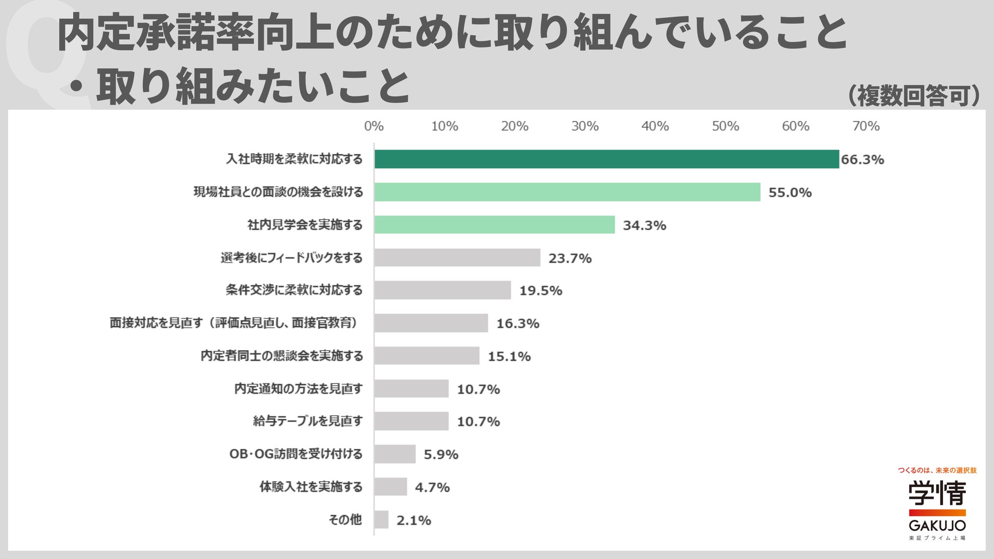 内定承諾率向上のために取り組んでいること・取り組みたいこと(複数回答可)は、「入社時期を柔軟に対応する」が66.3%で最多。次いで、「現場社員との面談の機会を設ける」55.0%、「社内見学会を実施する」34.3%が続きました。