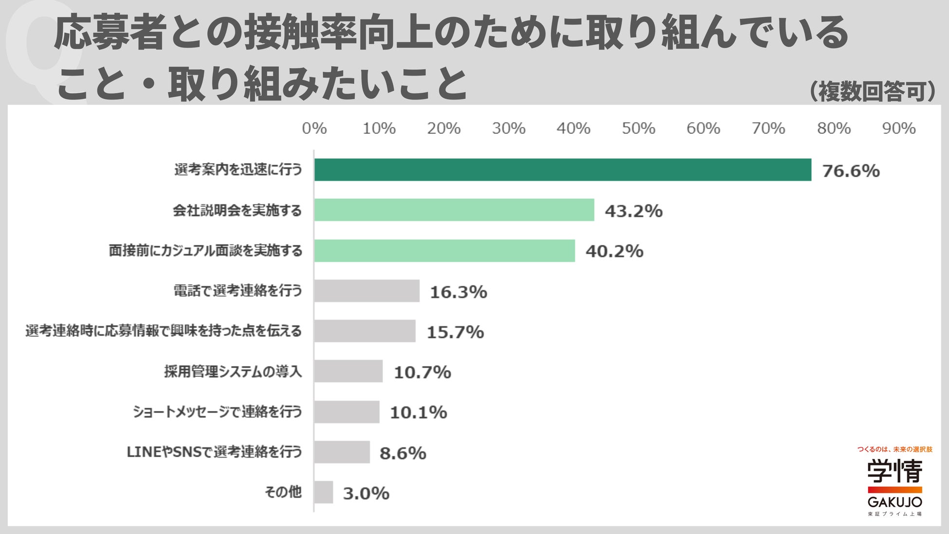 応募者との接触率向上のために取り組んでいること・取り組みたいこと(複数回答可)は、「選考案内を迅速に行う」が76.6%と突出して高く、次いで「会社説明会を実施する」が43.2%。続く「面接前にカジュアル面談を実施する」が、昨年の28.7%から40.2%に急伸したのが目立ちます。