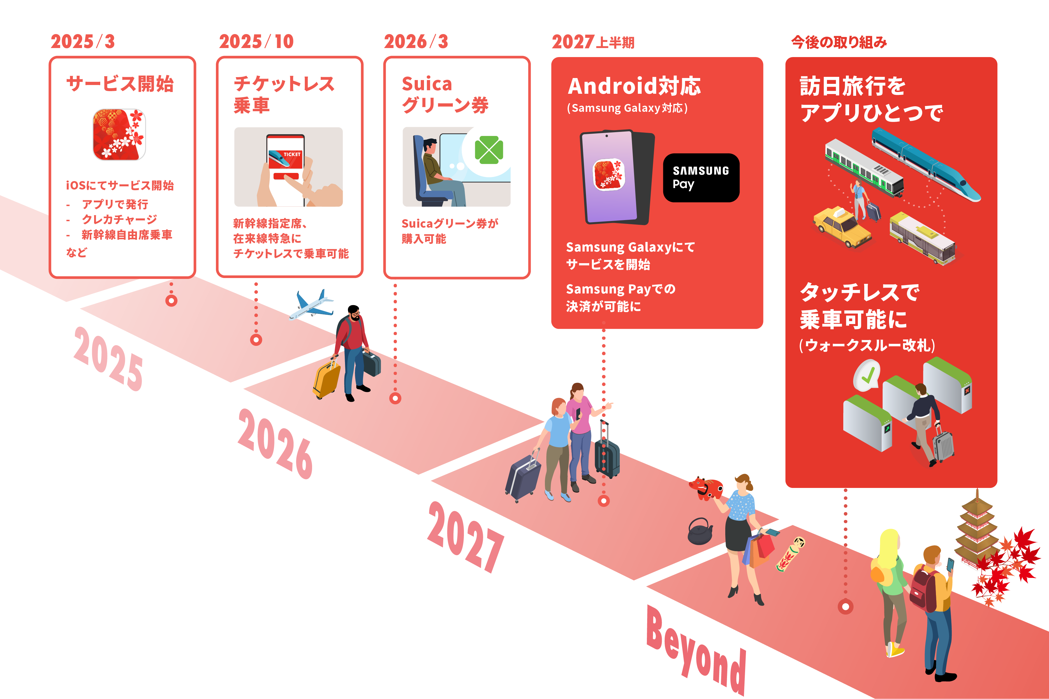 2027年上半期には、Welcome Suica Mobile(Samsung Galaxyスマートフォン)にて以下のサービスを実現します。