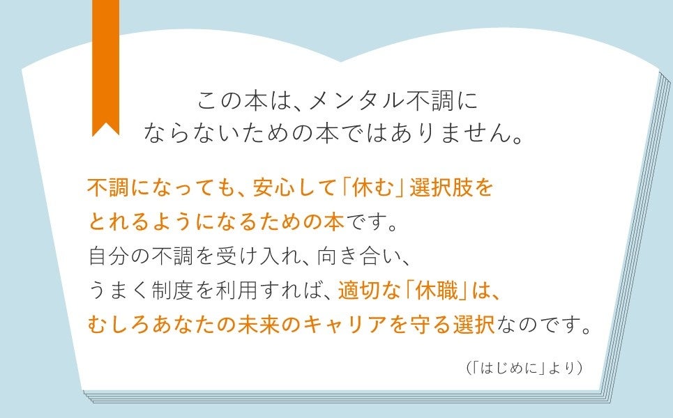 本書は、不調になっても安心して「休む」選択肢をとれるようになるために、休む判断、キャリアや転職・お金の問題、治療法、休職中の過ごし方、復職までの道筋など、必要な情報と実践的なアドバイスを提供します。