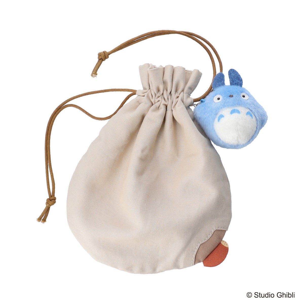 中トトロのマスコット付き巾着袋です。巾着を絞ると中トトロが大きな袋を背負っているように見え、内生地はどんぐりの総柄となっています。巾着の穴から落ちるどんぐりをダイカットの織りネームで表現した、となりのトトロのストーリーを感じさせるデザインです。