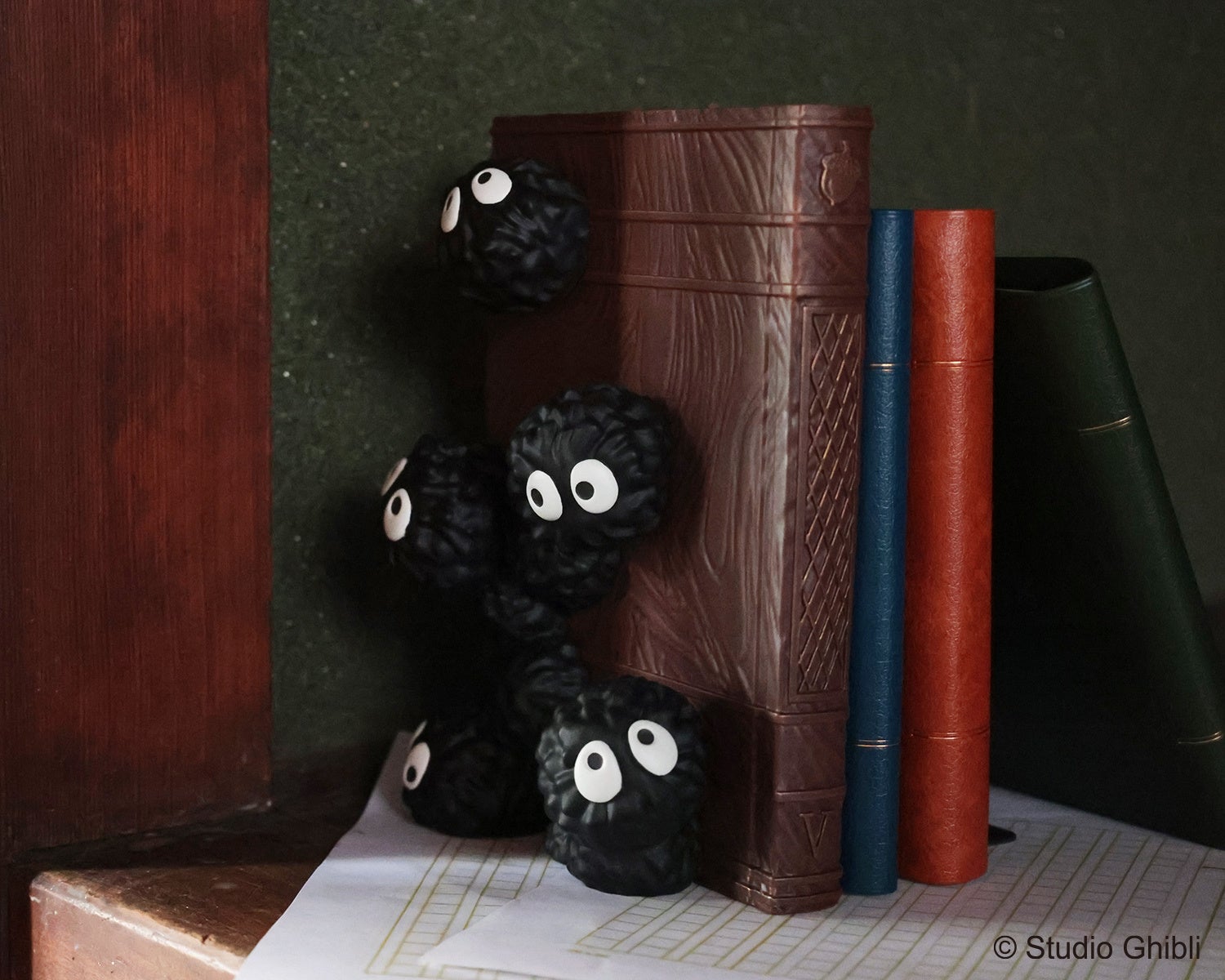 本の隙間に隠れるマックロクロスケたちを再現したブックスタンドです。アンティークな風合いの木目調の本には背表紙にどんぐりのレリーフがあしらわれています。本を置くと、まるで本当にマックロクロスケが自室にいるようなシーンを再現することができます。