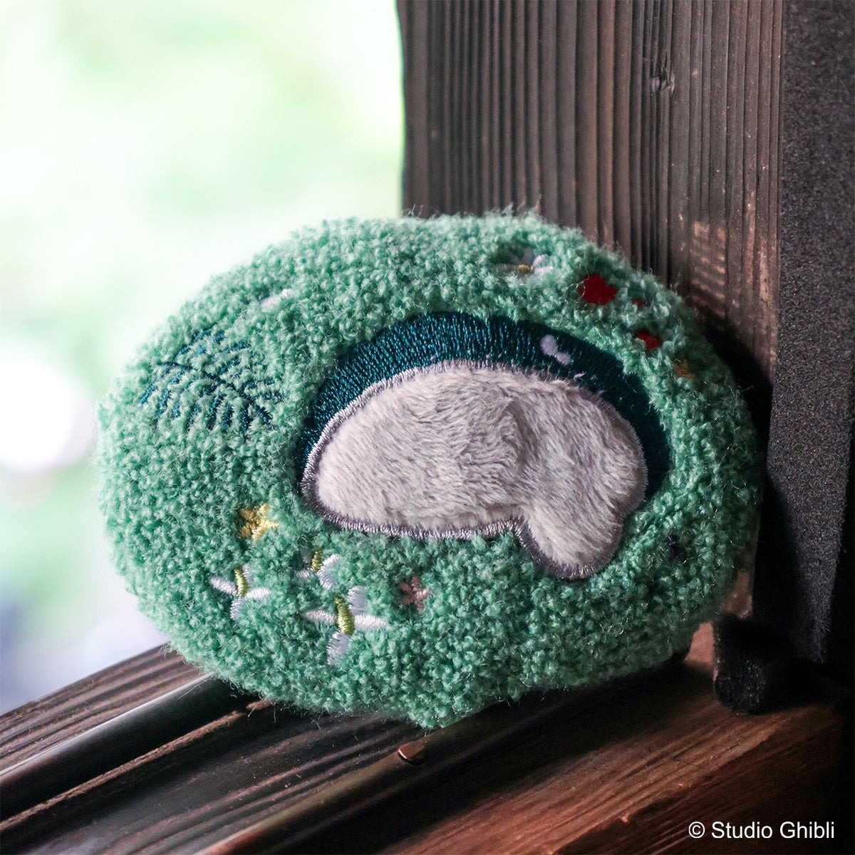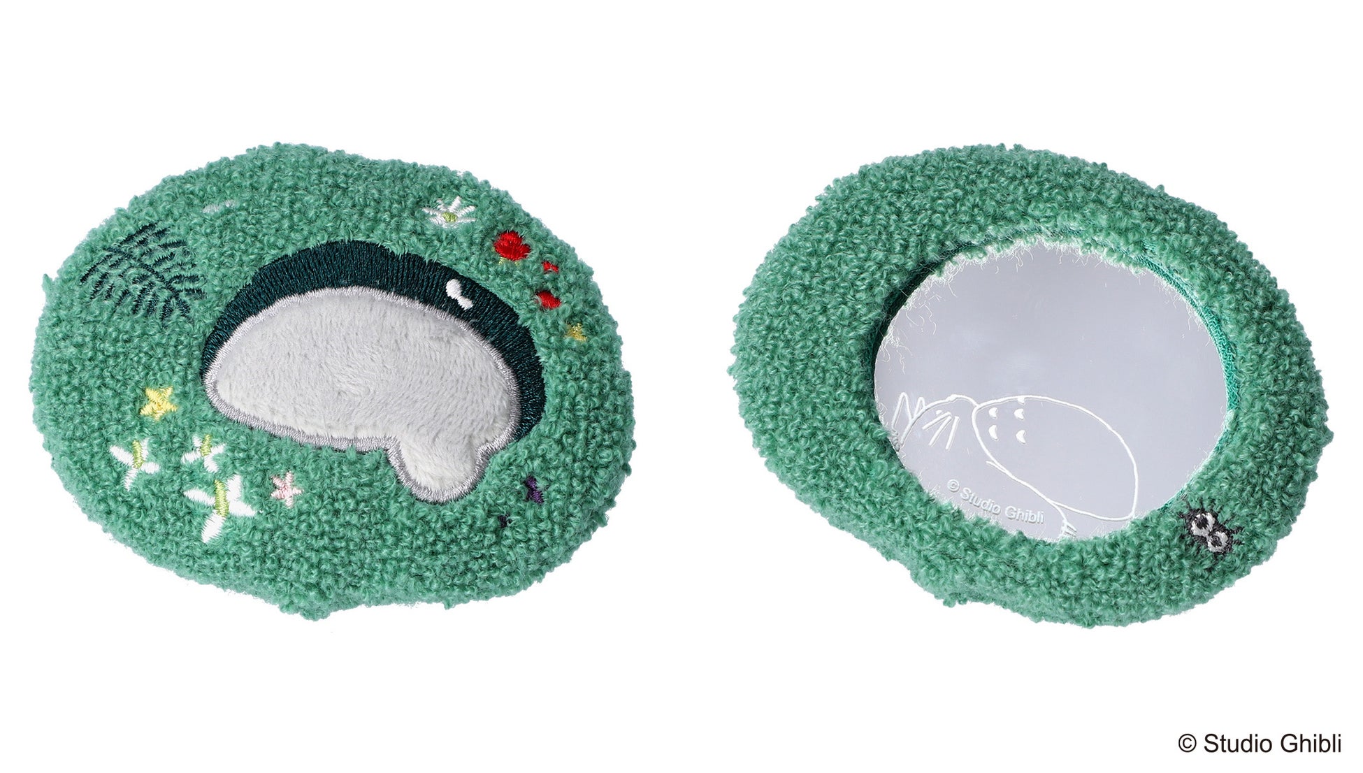 トトロの寝ている洞窟をイメージした、手のひらサイズのミラーです。表面の洞窟の周りに咲いている花や蝶々は刺繍で表現しており、寝ているトトロの部分は生地感を変えてふわふわとした質感です。