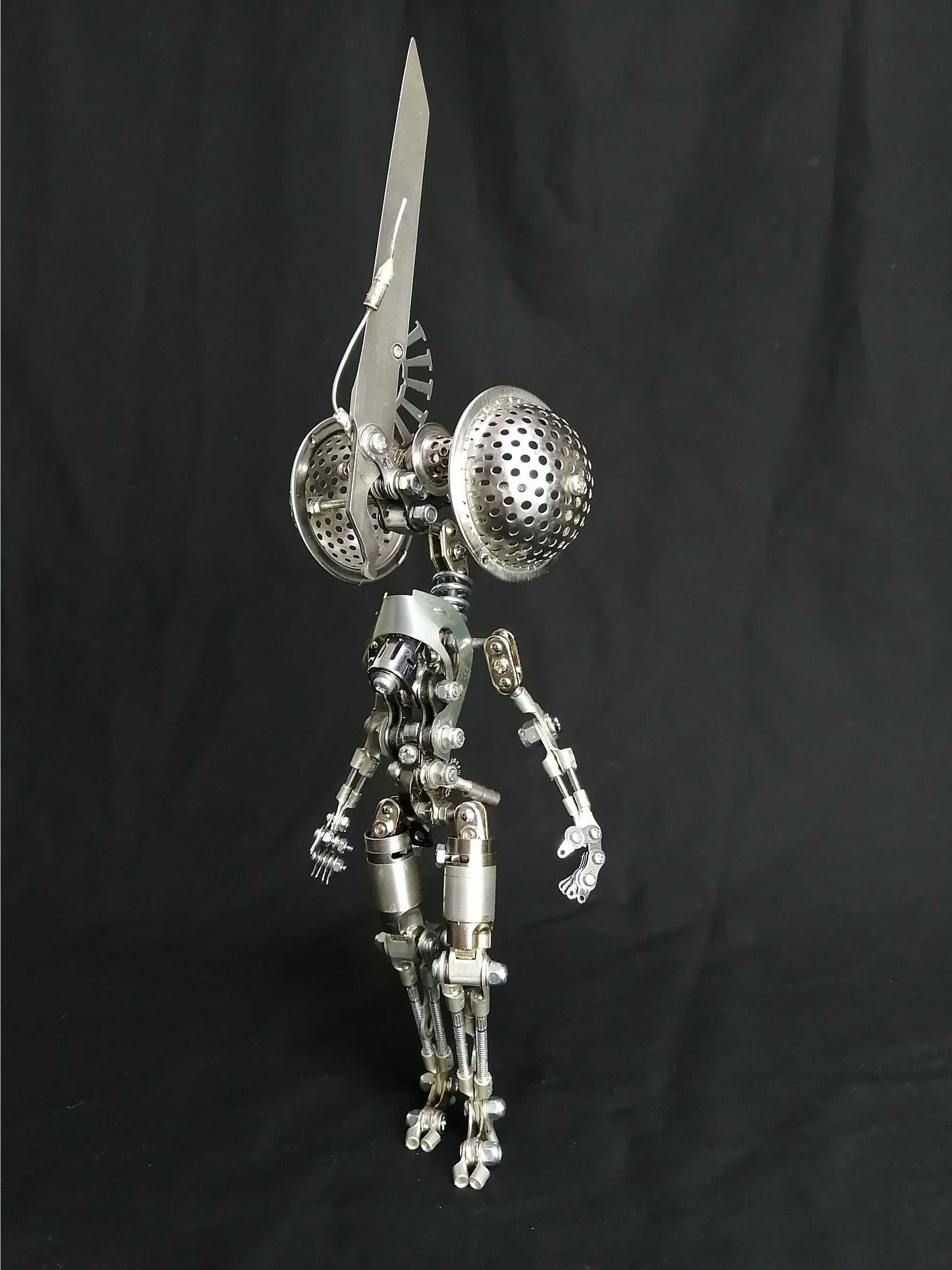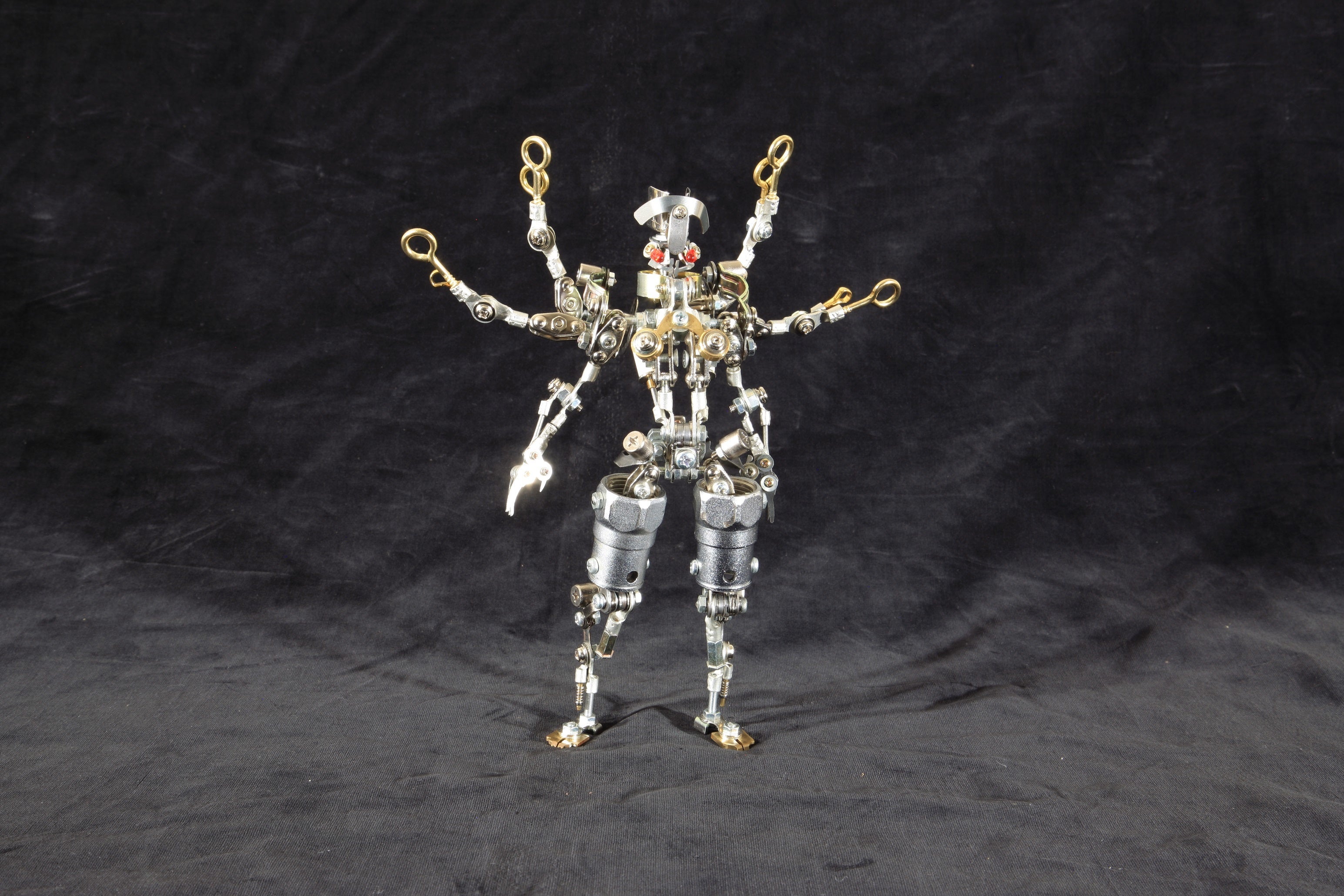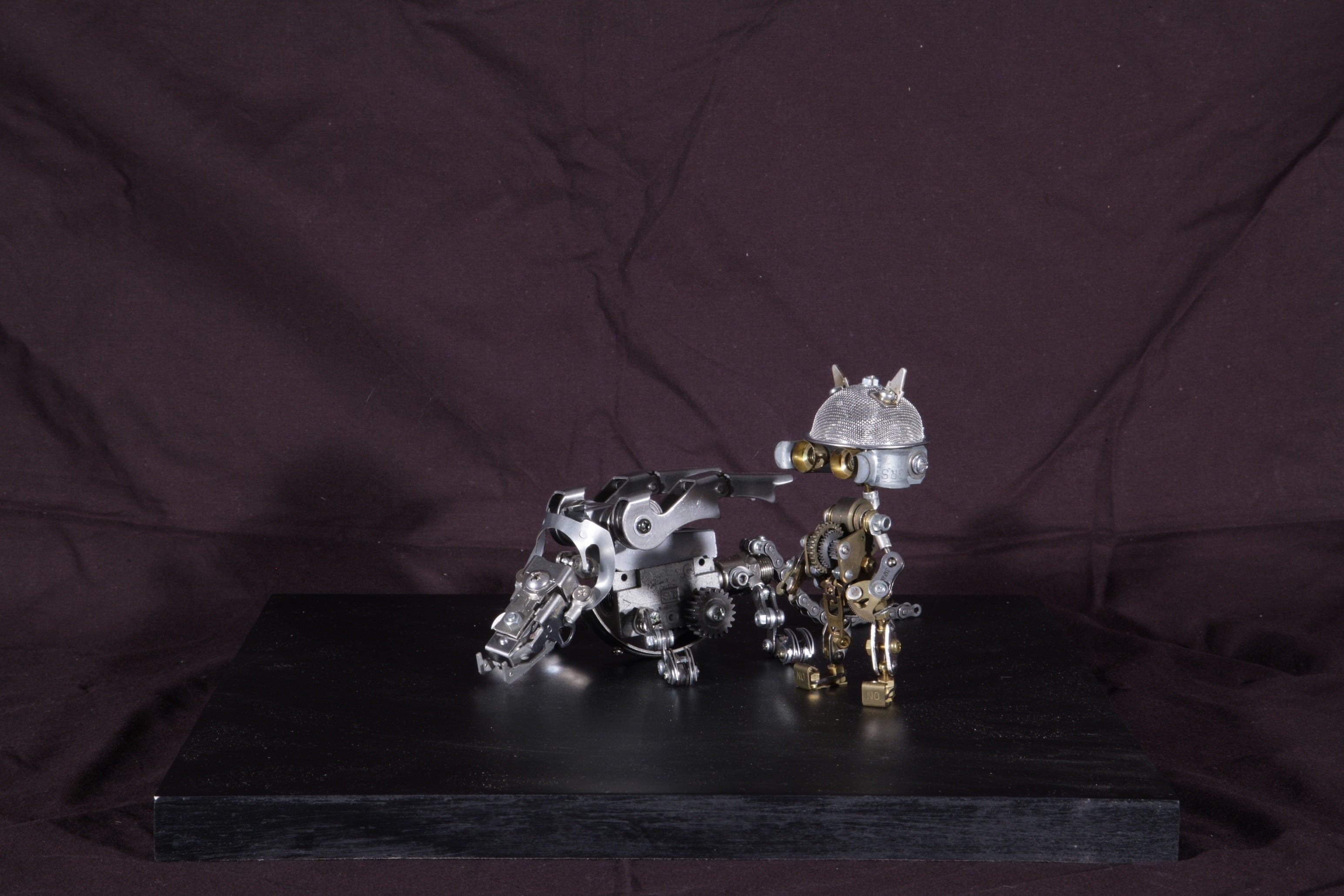 下平大輔は工業技術と模型技術を使った造形作品を制作し、外側の形だけでなく、内側の構造まで造形しております。使用する部品は廃材の山から拾い集めた金属の部品であり、シルエットを決め、その形のイメージに合う部品を当てはめ、ねじとナットを繋ぎ合わせた関節部分組み上げ、なるべく人間と同じように、全身の関節を動かせるようにこだわって制作しています。今回の展覧会では大小作品50点を展示いたします。ぜひこの機会にご高覧賜りますようご案内申し上げます。