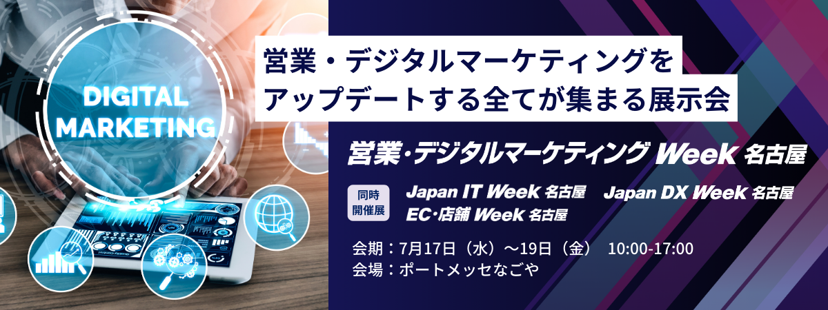 「Japan IT Week」は12の構成展示会で開催しておりましたが、構成展の中で営業やデジタルマーケティングに関連したエリアをさらに拡大し、より充実した内容にリニューアルして今年7月開催の名古屋展から「営業・デジタルマーケティング Week 名古屋」として開催いたします。