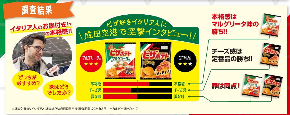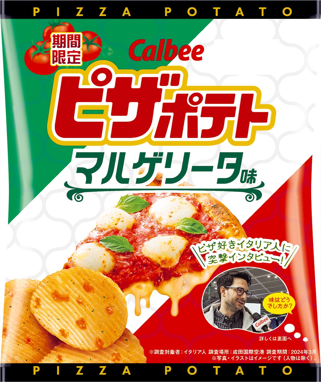『ピザポテト マルゲリータ味』は2011年に新しいフレーバーとして期間限定で発売。2020年にはモッツァレラチーズパウダーを使い、本格的な味わいを再現したことで、お客様から「マルゲリータの再現度が高い」「定番化して欲しい」(一部抜粋)など大変好評をいただきました。今年は、さらにニンニクの風味を感じやすくすることで、「ピザポテト」らしいやみつきになる味わいにアップデートしています。当商品のおいしさを確かめるために成田空港でインタビューも実施。特に「本格感」についてピザ好きのイタリア人にお墨付きをいただきました。