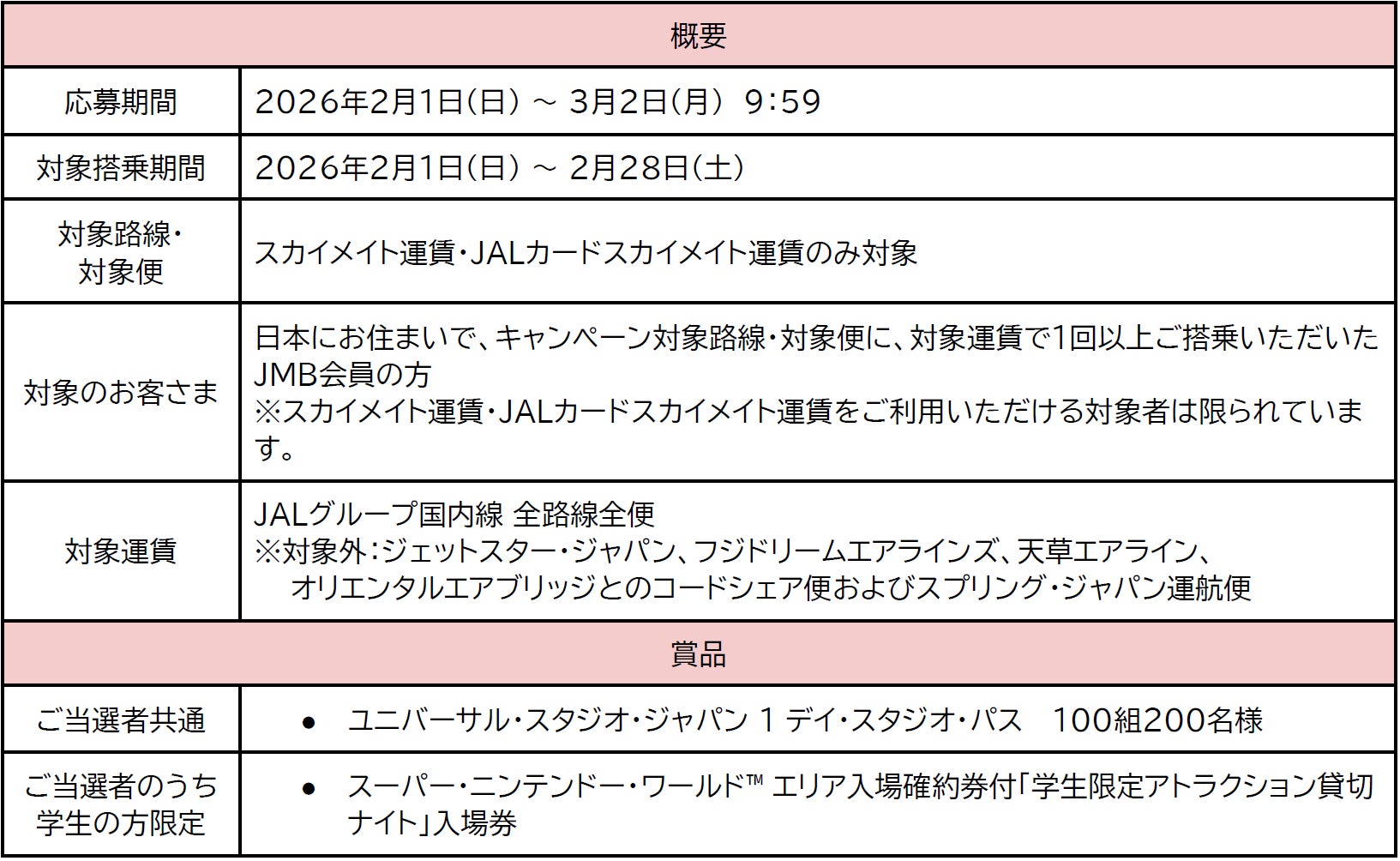 本キャンペーンでは、「スカイメイト」をご利用いただいたJMB会員の中から、抽選でユニバーサル・スタジオ・ジャパンの1デイ・スタジオ・パスをプレゼントし、さらに学生のお客さまには、スーパーニンテンドーワールド™エリア入場確約券付「学生限定アトラクション貸切ナイト」の入場