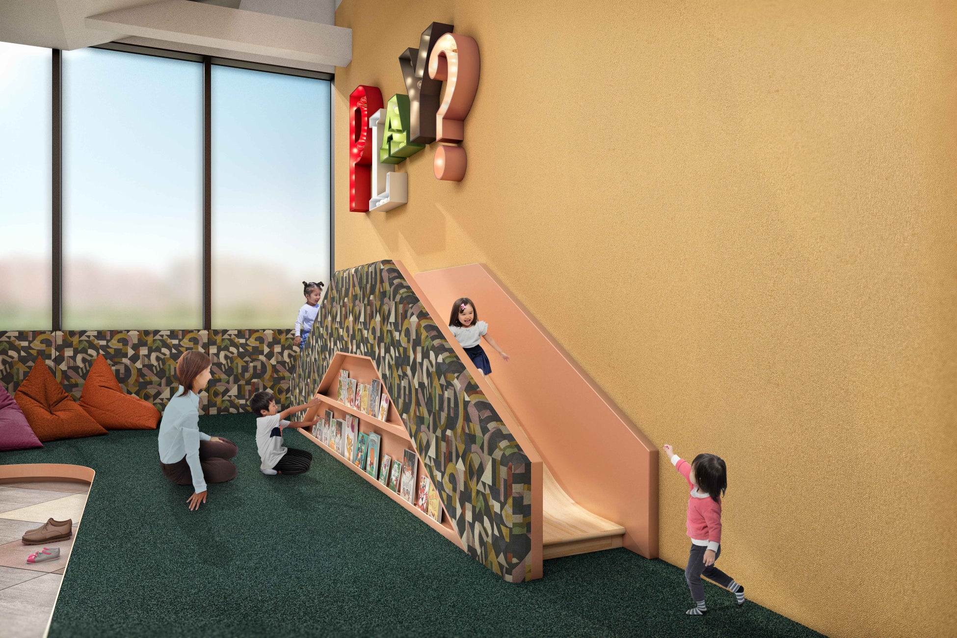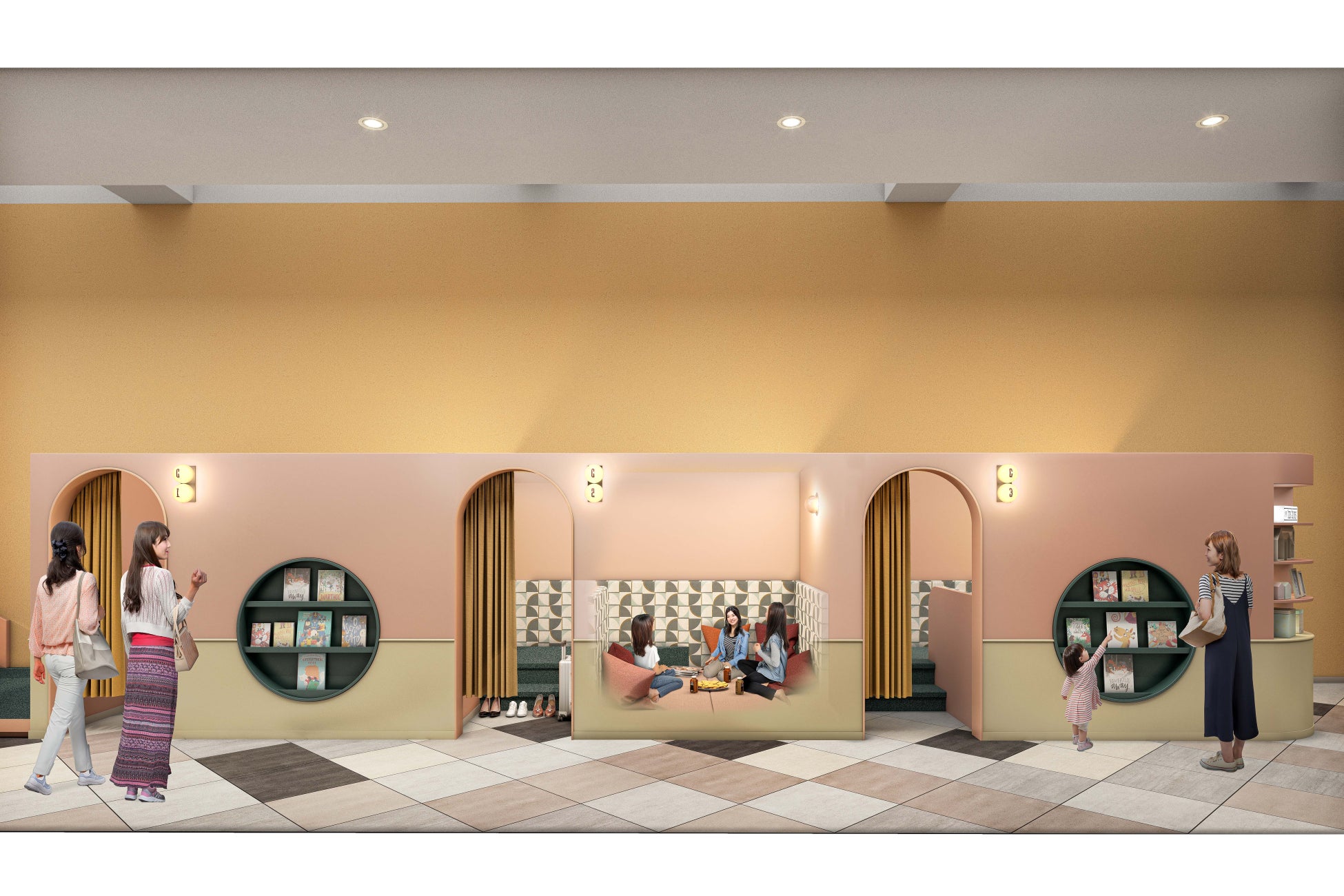 子どもも楽しく快適に過ごせる、キッズスペースが新たにできます。ビンテージの木馬のおもちゃにまたがって遊んだり、すべり台でアトラクション気分を味わったり、絵本を読んで過ごしたりと、お子様の年齢や気分に合わせて思い思いに過ごせます。子どもが靴を脱いで遊べるだけでなく、大人もアイランドソファーに腰かけて近くで見守ることができるので安心です。