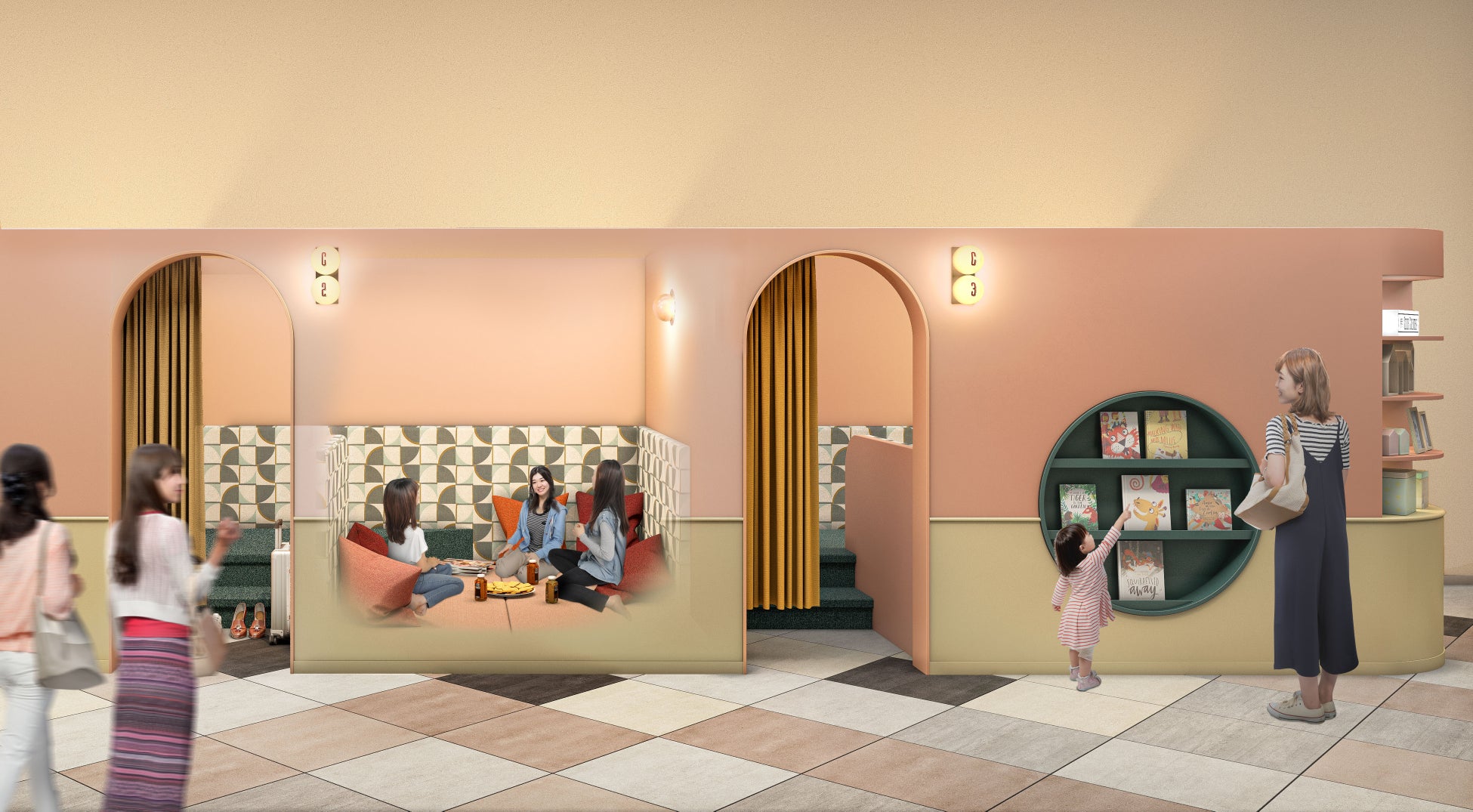 「2nd Room」で特に人気の、カーテンを引いて使える半個室が、今回新たに3室できます。増設される半個室は、秘密基地のような作りが特徴です。カーテンに加えて入り口とくつろげるスペースの間を仕切る壁があるので、より人目を気にせず快適にくつろげます。荷物の整理をしたり、身支度を整えたり、お菓子をつまみながら語り合ったり、家族や友人とお部屋にいるように過ごすのがおすすめです。