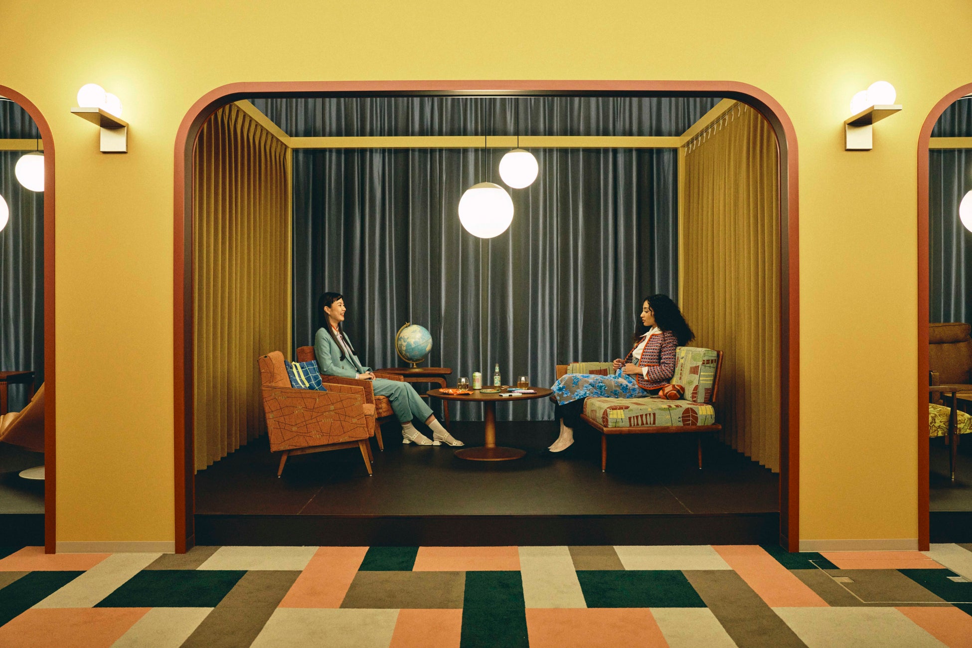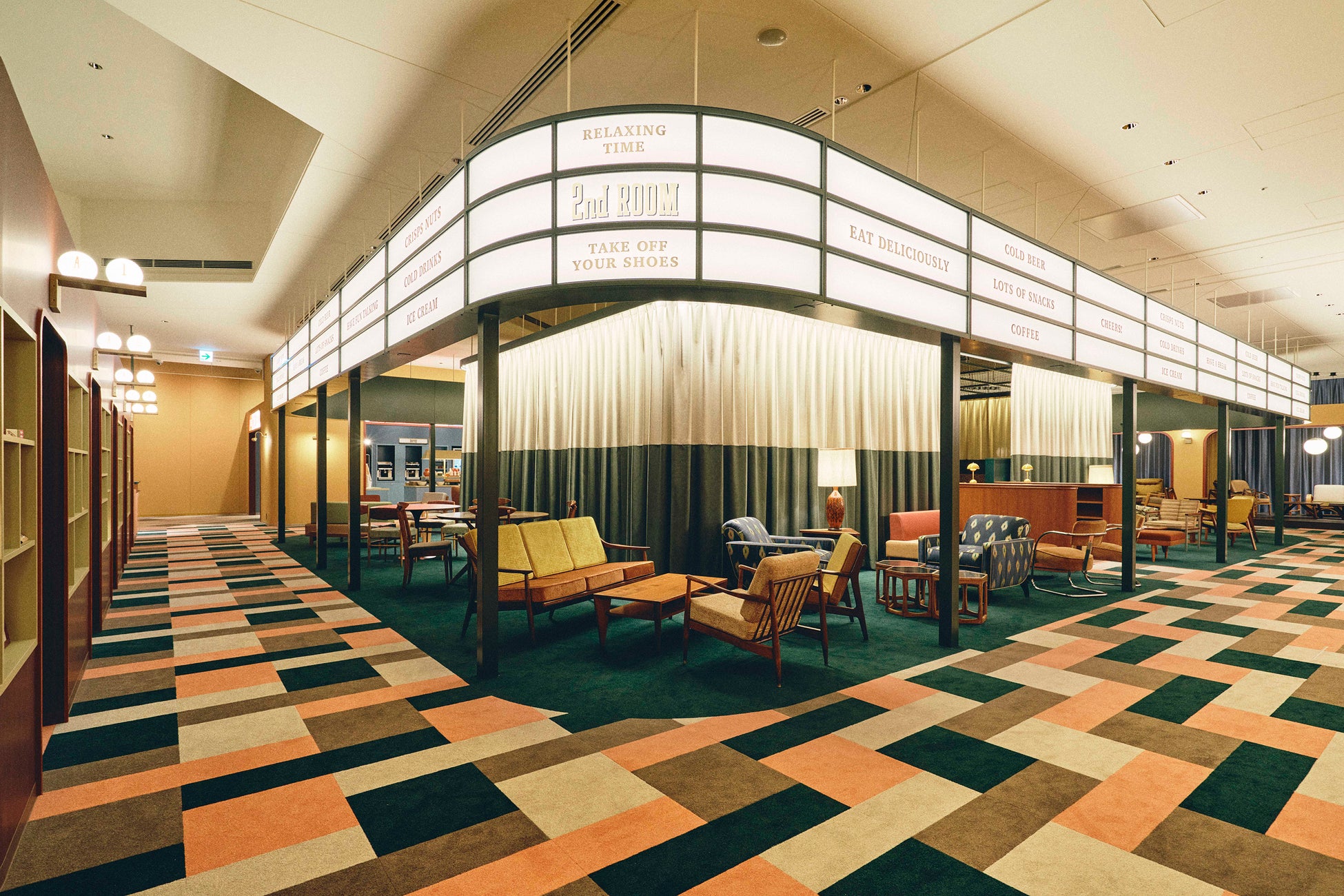 宿泊者の方はいつでも自由に過ごせるパブリックスペース。1955年頃のアメリカで流行していたミッドセンチュリーデザインのテーブルや椅子が並ぶスペースや、靴を脱いで過ごせるリラックススペース、カーテンを引いて半個室として使えるスペースなどがあり、好みの場所でくつろげます。24時間利用できるショップ「Food & Drink Station」や、夜23時まで出来立ての食事が楽しめる「Cafeteria」も隣接しており、ドリンク片手にお菓子やおつまみを食べながら、思い思いに過ごせます。
