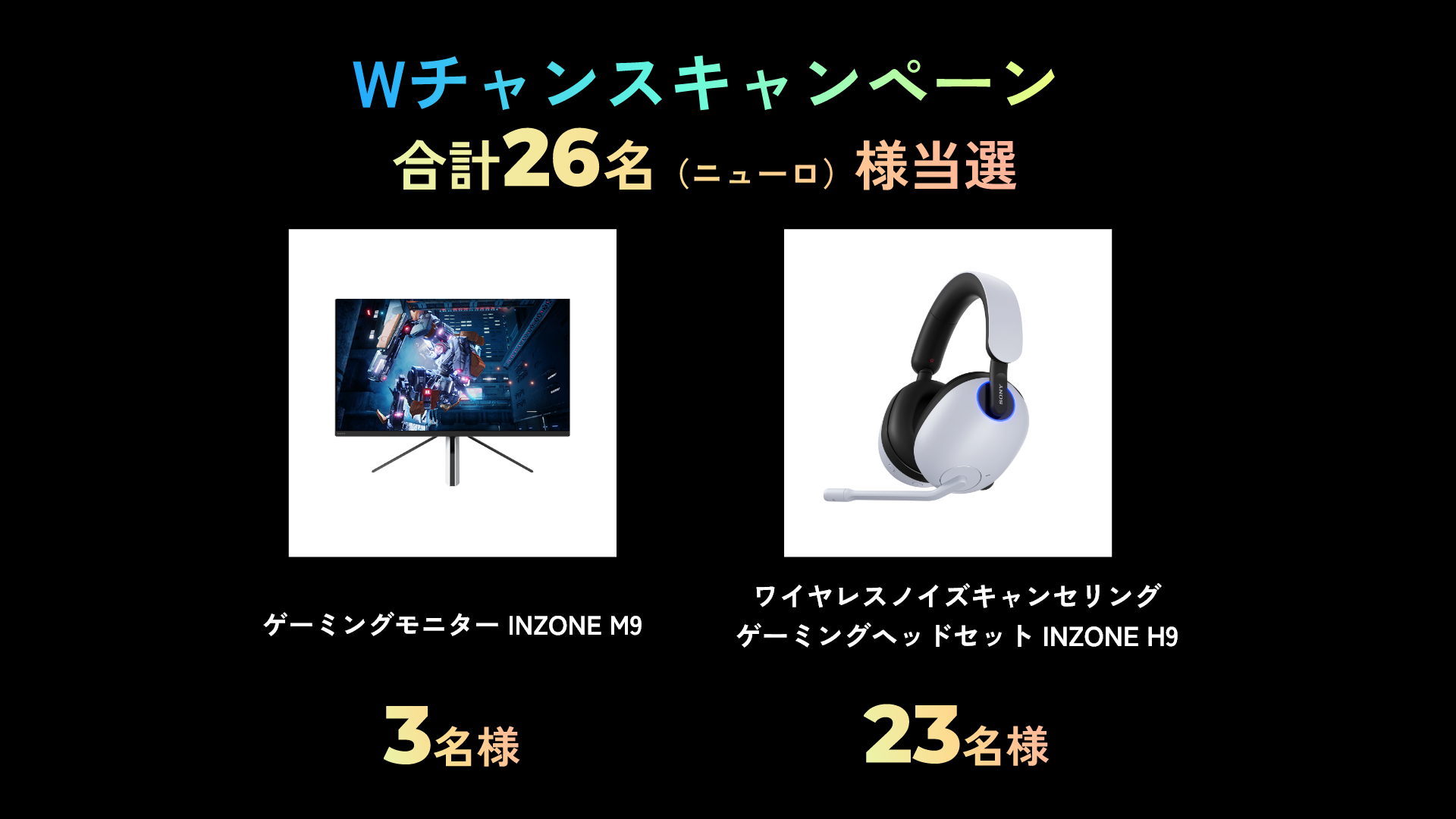・Wチャンスキャンペーンとして、クーポンを利用した方の中から抽選で総勢26名に「ワイヤレスノイズキャンセリングゲーミングヘッドセット INZONE H9」(23名)または「ゲーミングモニター INZONE M9」(3名)をプレゼント。