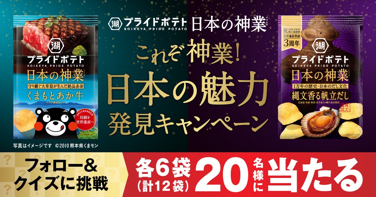 熊本・縄文の“神業”が込められた当商品の発売を記念し、各地の“日本の神業”に関するクイズに答えてご応募いただくと、「湖池屋プライドポテト 日本の神業」シリーズの商品が抽選で20名様に当たる「これぞ神業!日本の魅力発見キャンペーン」を実施します。みなさまぜひご参加ください!