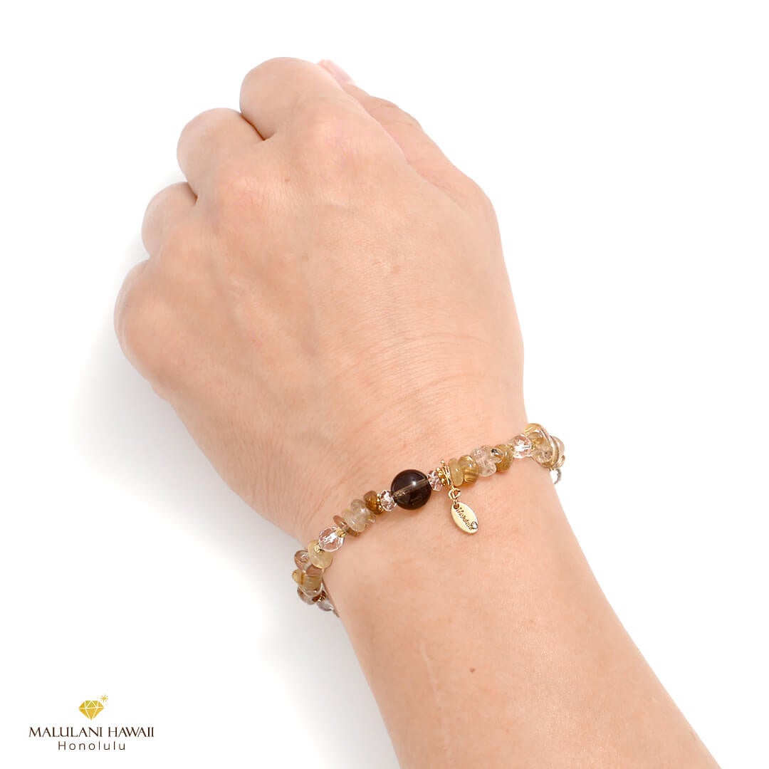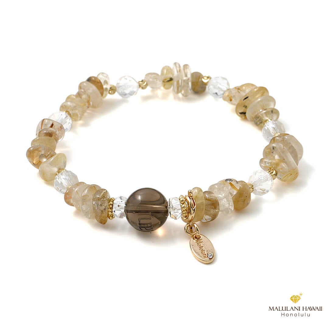 ブレスレットのスモーキークォーツとオリジナルチャームには、ハワイ語で「神のご加護」の意味を持つ 「Malulani」と刻印。