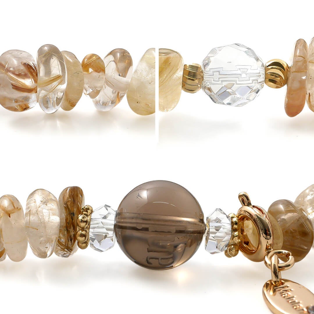 金運やチャンス、良縁など、必要を呼び込む最強の石として愛されているルチルクォーツと、グラウンディングや財運、健康のお守りとして名高いスモーキークォーツ、すべてを清める水晶を、シンプルに仕立てたブレスレット。