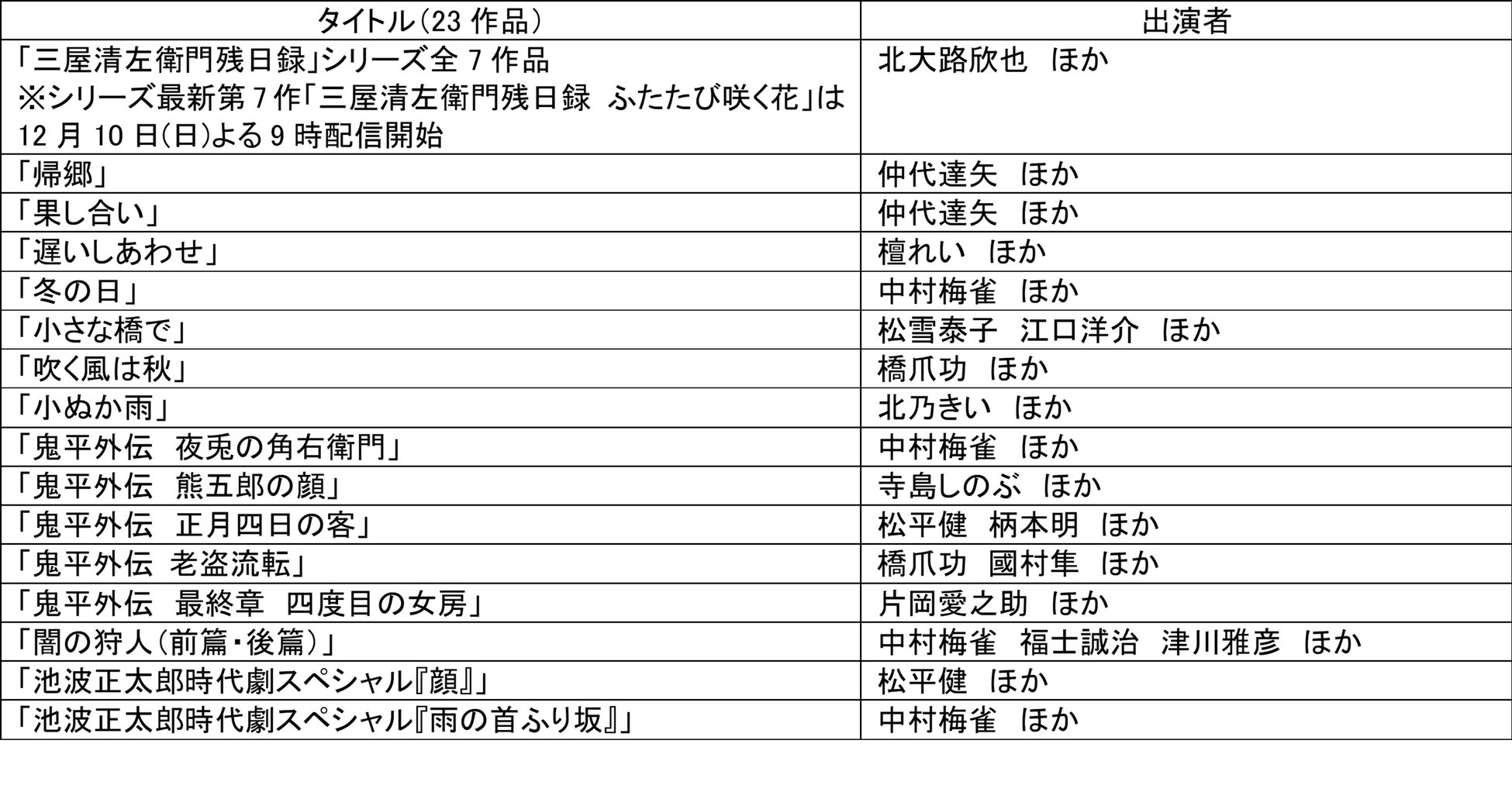 ※「J:COM STREAM 見放題」では、「三屋清左衛門残日録」シリーズ第1作から第6作を除く、17作品の配信開始日は12月10日です。