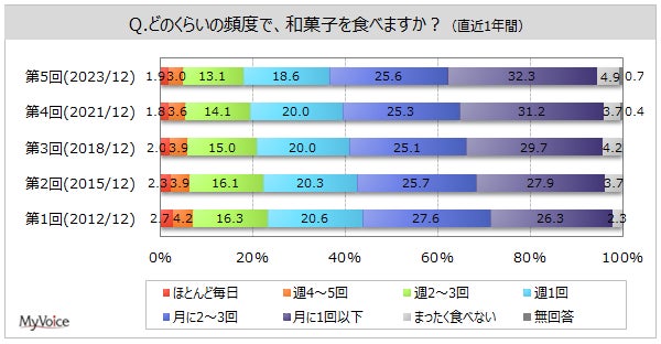 <今 回>(2023/12)https://myel.myvoice.jp/products/detail.php?product_id=30503 上記設問の他に、「和菓子の嗜好度」「和菓子の購入目的」も聞いています。 <第4回>(2021/12)https://myel.myvoice.jp/products/detail.php?product_id=28103 <第3回>(2018/12)https://myel.myvoice.jp/products/detail.php?product_id=24502 |