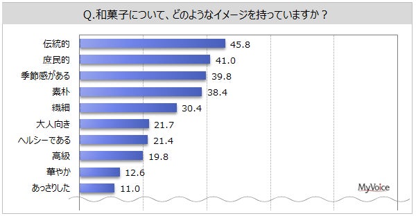 ■和菓子のイメージは「伝統的」「庶民的」が各40%台、「季節感がある」「素朴」「繊細」が各30%台
