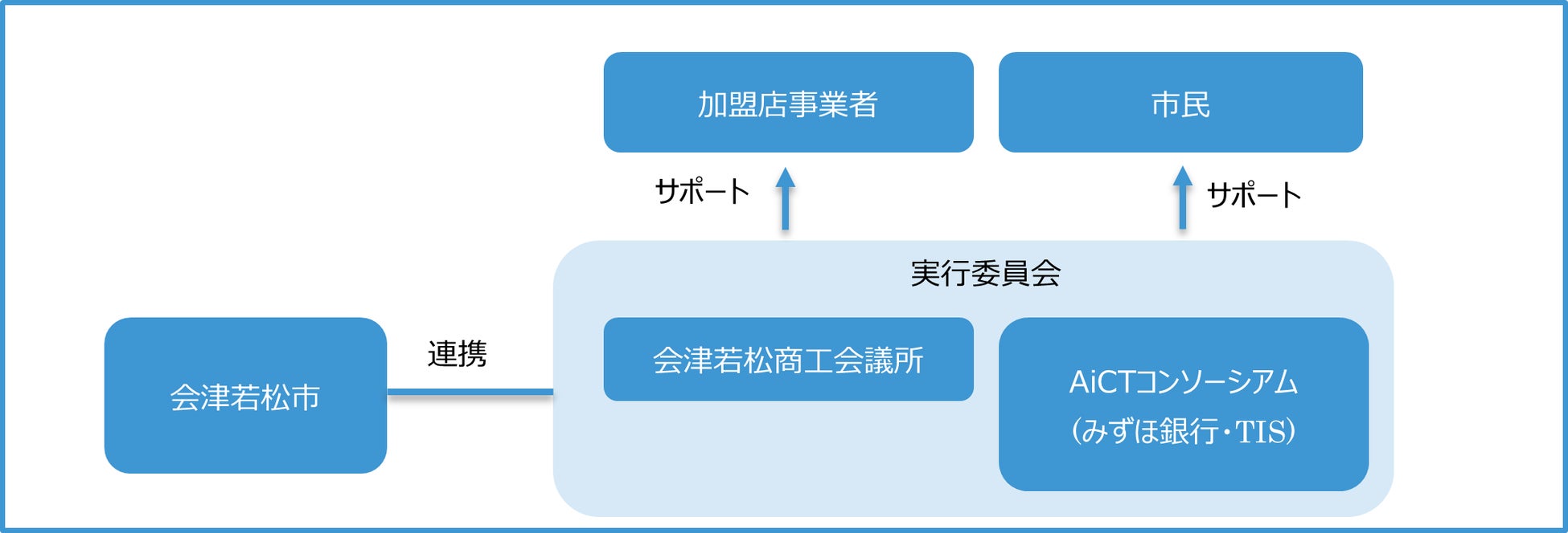 ●2023年12月の本事業の開始を目指し、本日会津若松商工会議所とあいづ商工会、AiCTコンソーシアムが本実行委員会を結成します。加盟店事業者のサポートを会津若松商工会議所およびあいづ商工会が、本サービスの利用者およびデジタル全般のサポートをAiCTコンソーシアムが担い、一体となって地域経済の活性化ノウハウとデジタルを融合した施策に取り組みます。