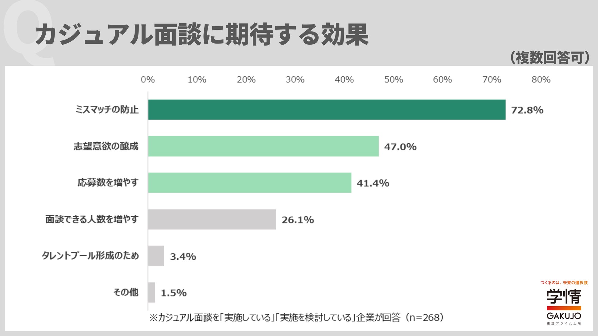 「カジュアル面談」に期待する効果(複数回答)については、「ミスマッチの防止」が72.8%で最多。次いで、「志望意欲の醸成」47.0%、「応募数を増やす」41.4%が続きました。