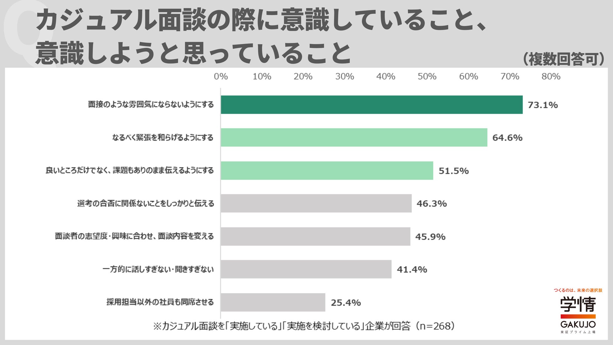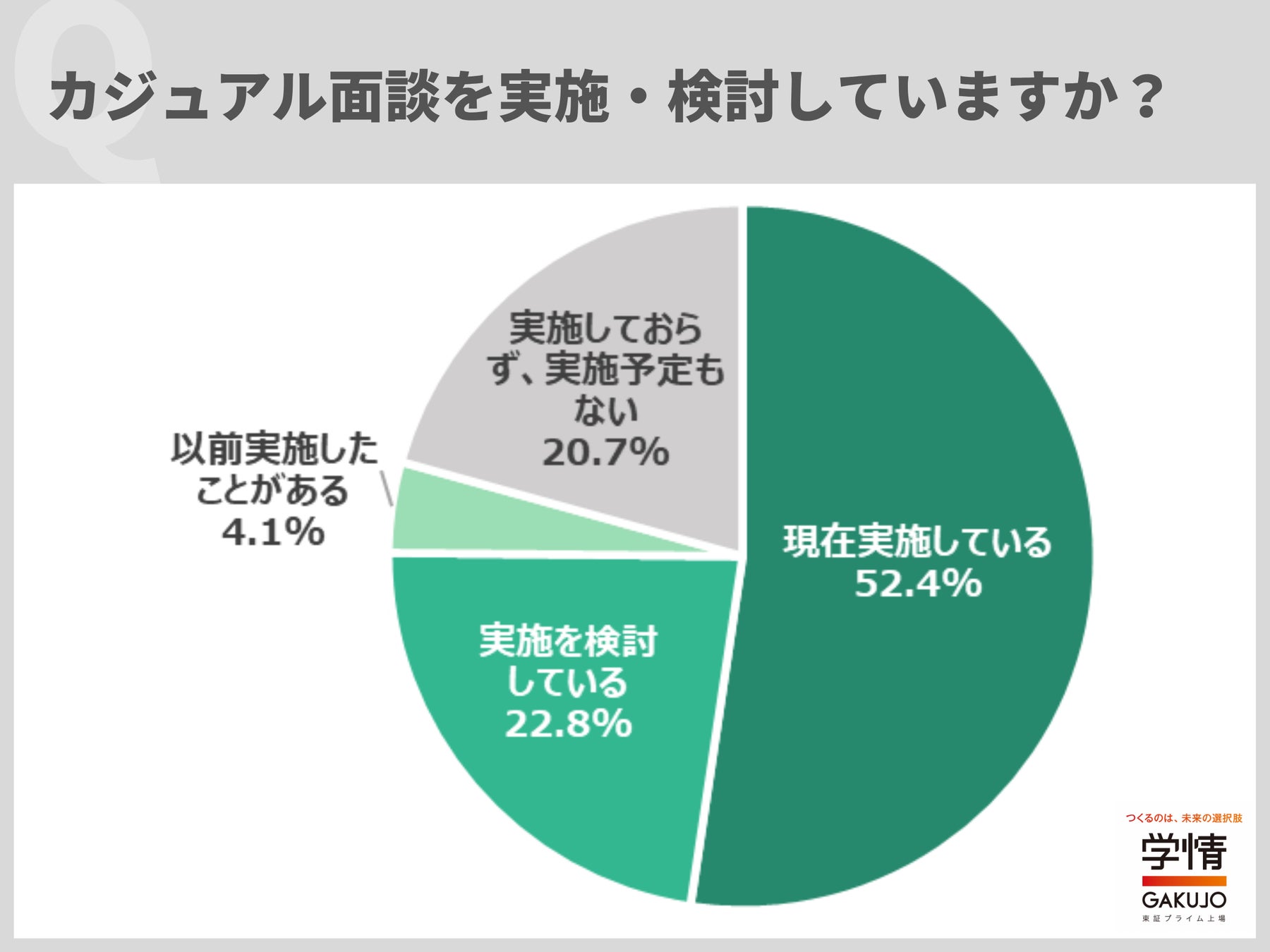 株式会社学情(本社:東京都中央区)は、企業・団体の人事担当者を対象に「カジュアル面談」についてインターネットアンケートを実施しました。キャリア採用においてカジュアル面談を「実施している」と回答した企業が52.4%に上り、過半数を占めました。前年調査の36.7%から急増しており、この1年でカジュアル面談が一気に広がったことが分かります。カジュアル面談に期待する効果は、「ミスマッチの防止」が最多。次いで、「志望意欲の醸成」「応募数を増やす」が続きました。