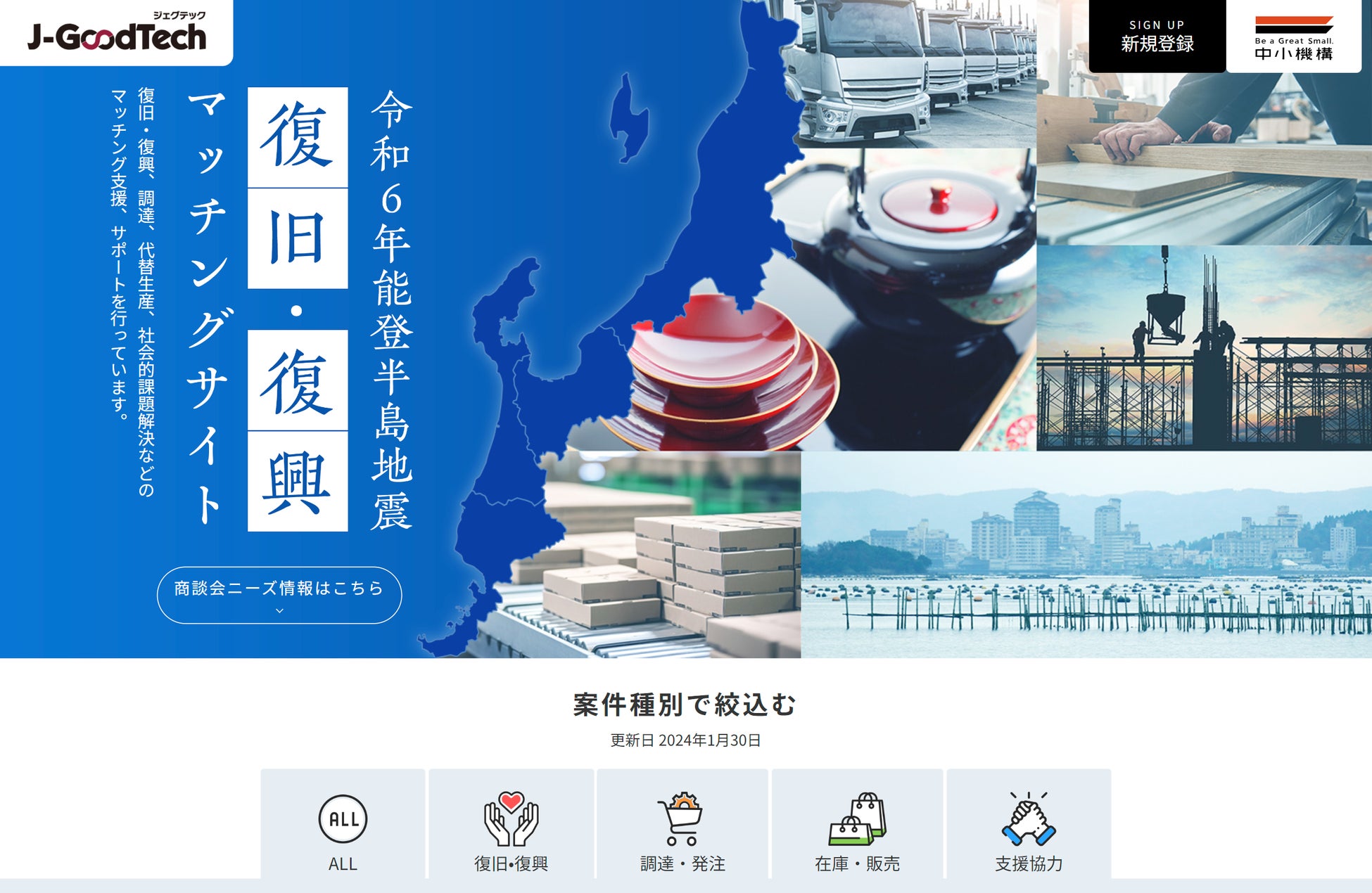 独立行政法人中小企業基盤整備機構(理事長:豊永厚志 所在地:東京都港区)は、能登半島地震で被災された中小企業の皆様が早期に事業を再開できるよう、年間10,000件のマッチング実績があるマッチングプラットフォーム(ジェグテック)内に、被災企業・地域の復旧・復興ニーズと、全国の大手企業、中小企業をつなぐ「復旧・復興マッチングサイト」を開設します。