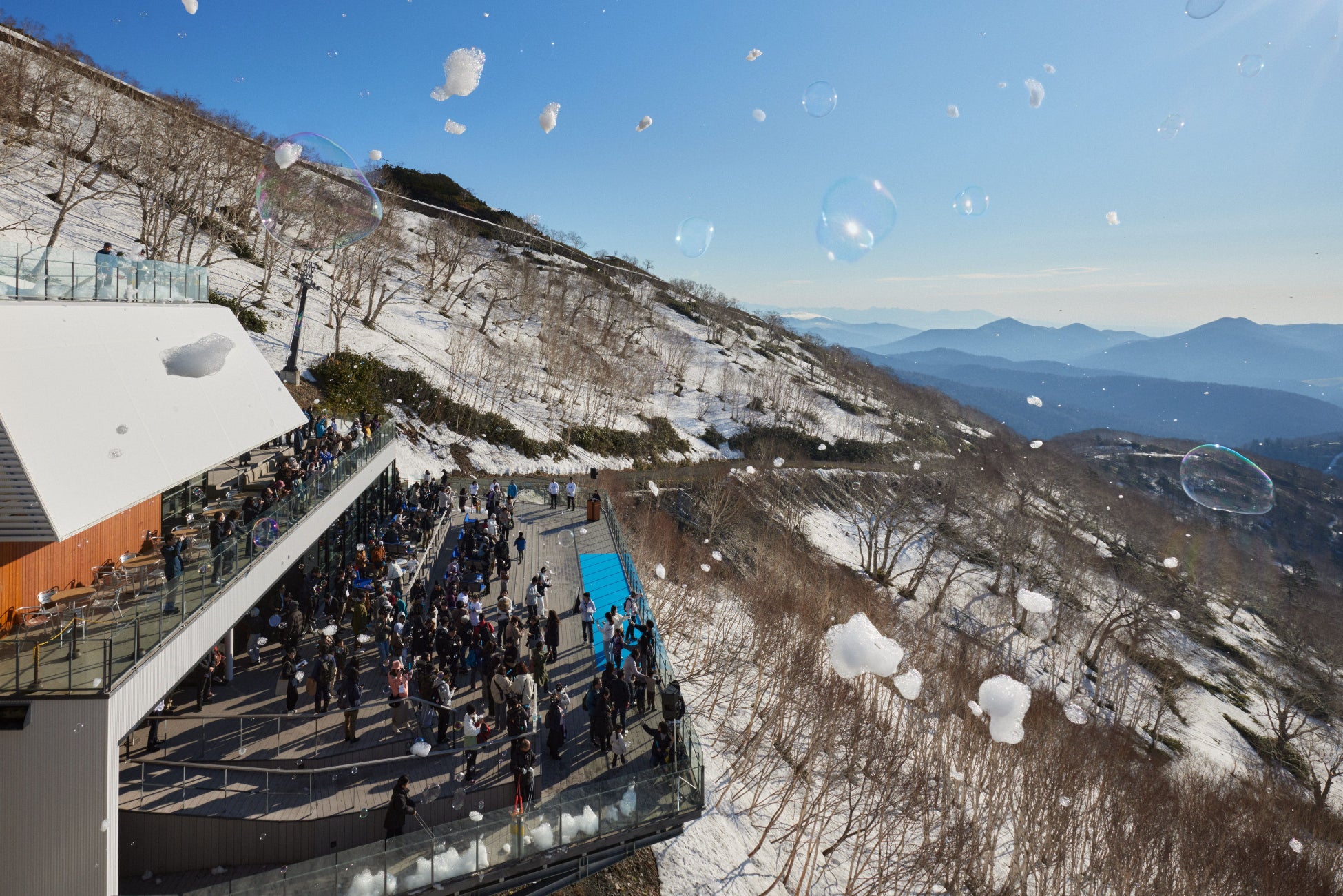 雲海テラスオープニングセレモニーは「雲海テラス」の営業開始日に、多くの方々が雲海に出会えることを願って毎年実施しています。今年はトマム産の雲海が発生しました。展望デッキでは、雲に見立てたシャボン玉を飛ばす「クラウドリリース」や、未来を開くという意味が込められたシャンパンオープンを実施。489名のお客様とともに雲海テラス20周年を祝うAnniversaryイヤーが幕を開けました。