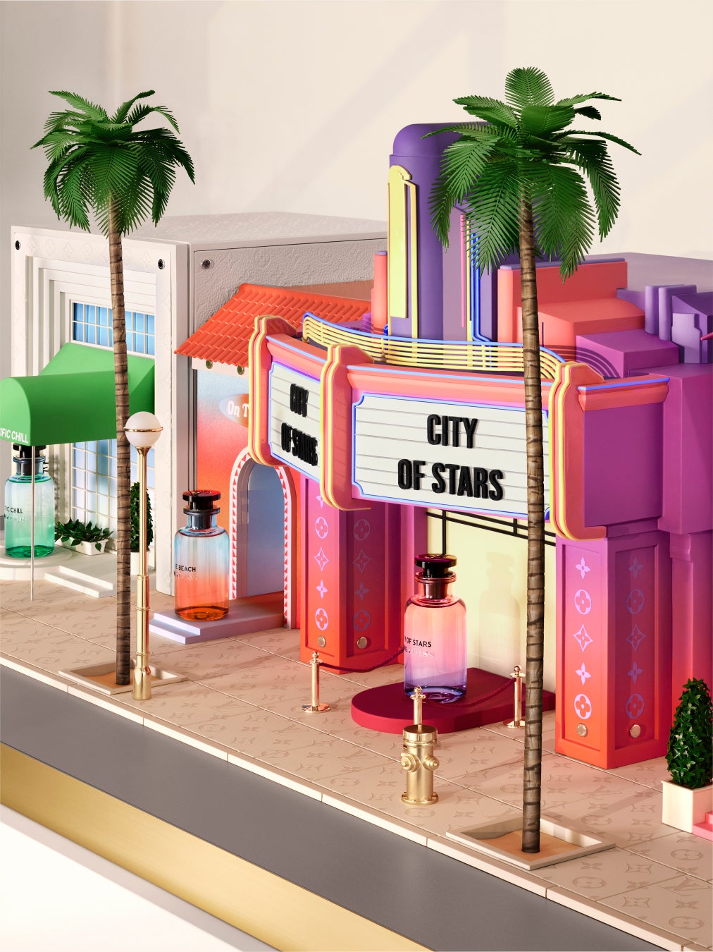 楽しい逃避行は「On the Beach (オン ザ ビーチ)」へと続きます。ここは、太陽がもたらす高揚感や海のリズム、そして肌に触れる砂の穏やかな温かさを想わせるフレグランスの発売を記念して作られた、アレックス·イスラエルのサイン入りサーフボードが出迎えるサーフショップ。このフレグランスは、鮮やかな柚子と柔らかなネロリからはじまり、砂浜を想わせるアロマティックハーブのノートによってその姿を現します。ボトルのカラーパレットに合わせて建物はレッドとオレンジのグラデーションで彩られ、ベニスビーチの空の色を想わせる柔らかなブルーに溶け込ませました。ルイ·ヴィトンを象徴するゴールドカラーの真鍮製リベットがファサードに仕上げのタッチを。この地では喜び溢れる海辺や大海原の呼び声、どこまでも続く楽しいビーチ、そして海のしぶきが鮮やかな紺碧の中で輝きを放ち、風景を一変させる様子を描き出します。