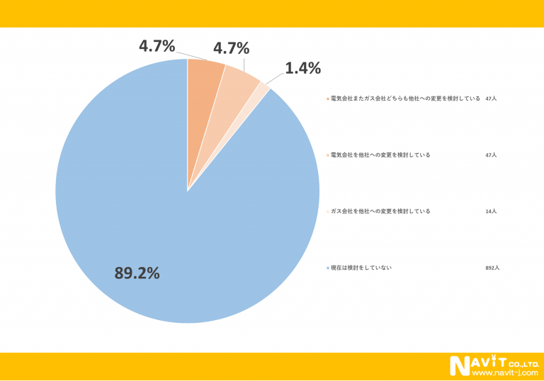 現在の電力会社やガス会社から他社への乗り換えを検討していますか?というアンケートに対して「電気会社またガス会社どちらも他社への変更を検討している」と回答された人が4.7%、「電気会社を他社への変更を検討している」と回答された人も同じ4.7%で「ガス会社を他社への変更を検討している」と回答された人が1.4%に留まっています。