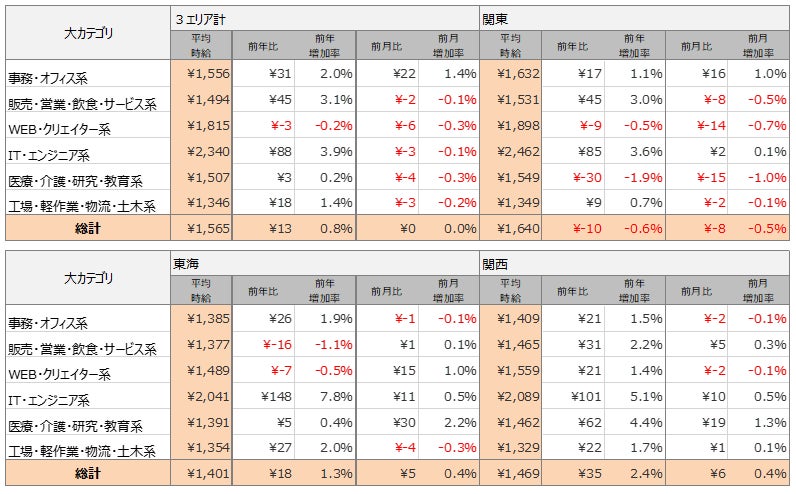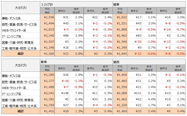 各エリアの平均時給について、関東エリアは1,640円(前年比10円減、前月比8円減)、東海エリアは1,401円(前年比18円増、前月比5円増)、関西エリアは1,469円(前年比35円増、前月比6円増)となりました。