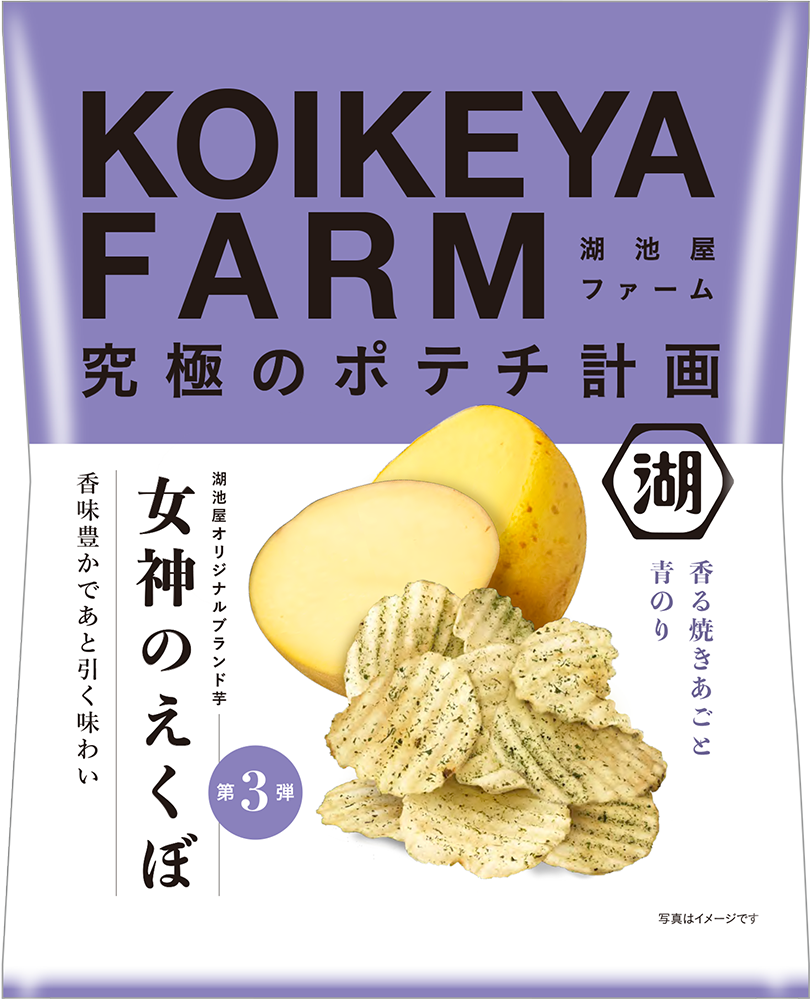 「女神のえくぼ」は、香ばしくほんのりと甘さを感じる豊かな香味が特徴で、余韻のあるあと引く旨みが味わえる湖池屋オリジナルブランド芋。食べると思わずニッコリ笑ってしまうような味わいから「女神のえくぼ」と名付けられました。崩壊感のある波型カットにすることで「芋の香りと味わい」を引き立て、香ばしい焼きあごと青のりで香味をさらに後押ししました。