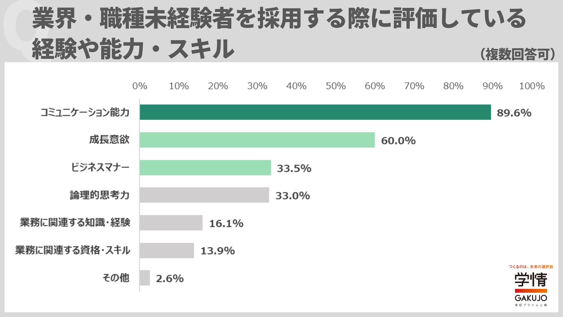 業界・職種未経験者を採用する際に評価している経験や能力・スキル(複数回答可)は、「コミュニケーション能力」が89.6%で最多。次いで「成長意欲」60.0%、「ビジネスマナー」33.5%、「論理的思考力」33.0%が続きました。コミュニケーション能力は、ほとんどの企業が必須の要素と位置付けていることが分かりました。