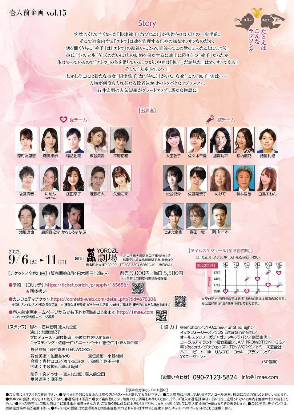 壱人前企画(代表:壱位仁井)主催、壱人前企画vol.15『たとえばこんなラブソング』が2022年9月6日 (火) ~2022年9月11日 (日)に萬劇場(東京都豊島区北大塚2-32-22)にて上演されます。