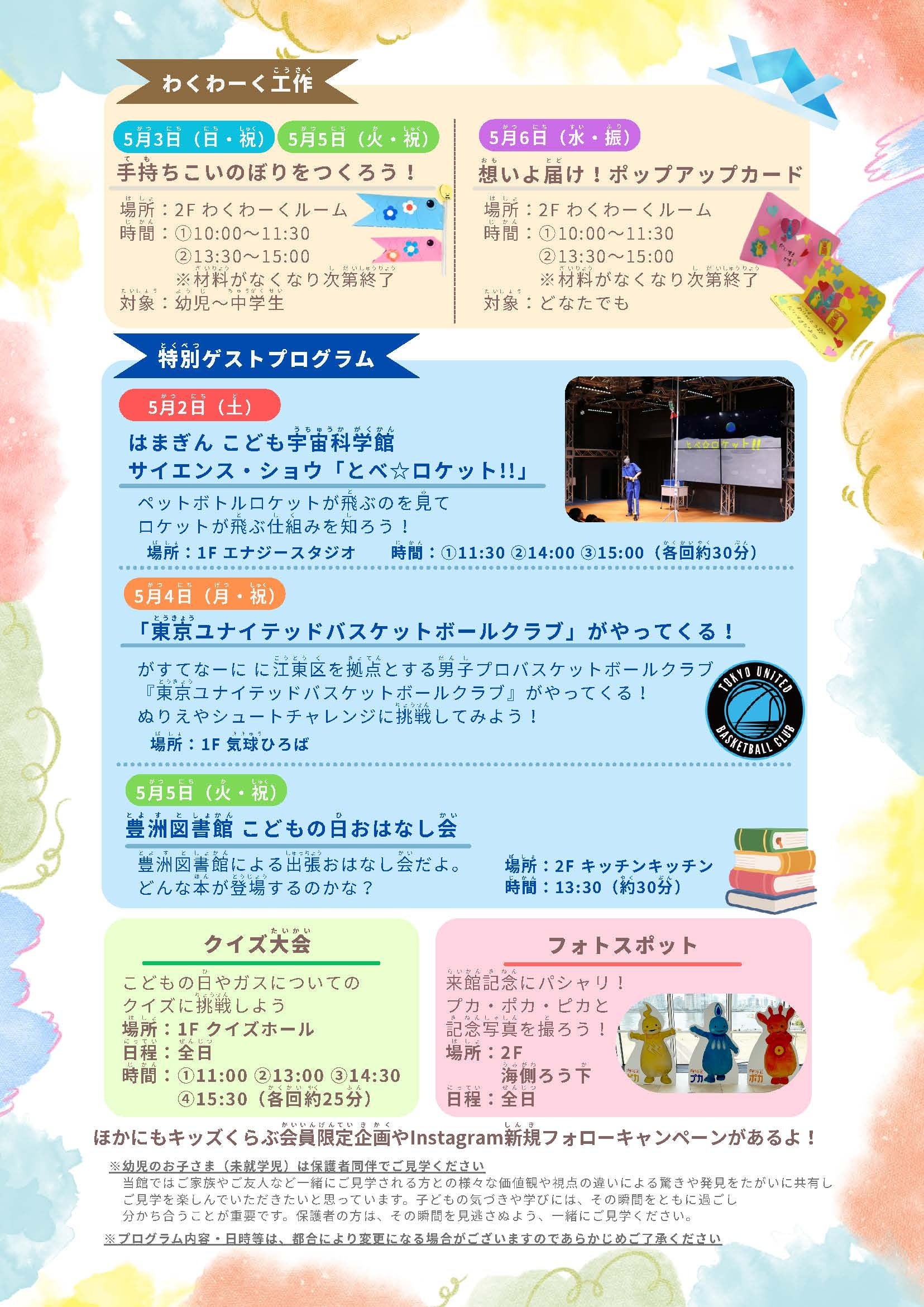 東京ガスの企業館「がすてなーに ガスの科学館」では、5月2日(土)から5月6日(水・振)まで、ゴールデンウィークならではの特別イベントを実施します。
