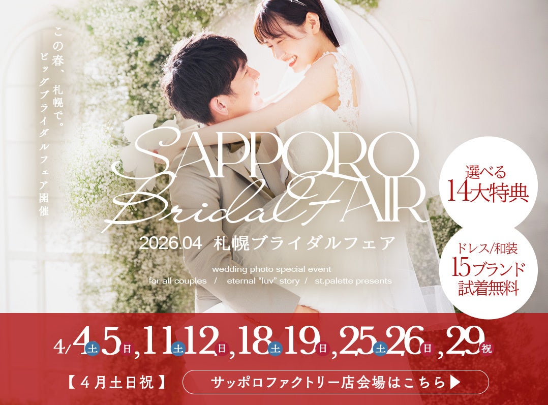 有限会社三景スタジオは、札幌のフォトウェディングスタジオ「写真工房ぱれっと」にて、最新衣装の無料試着や豪華14大特典を用意した「札幌ブライダルフェア」を開催します。