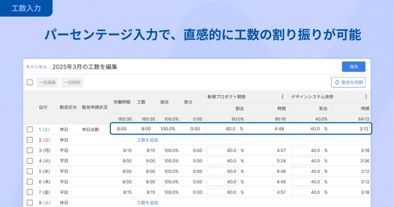 パーセンテージでの割合入力により、直感的に工数を割り振ることができます。