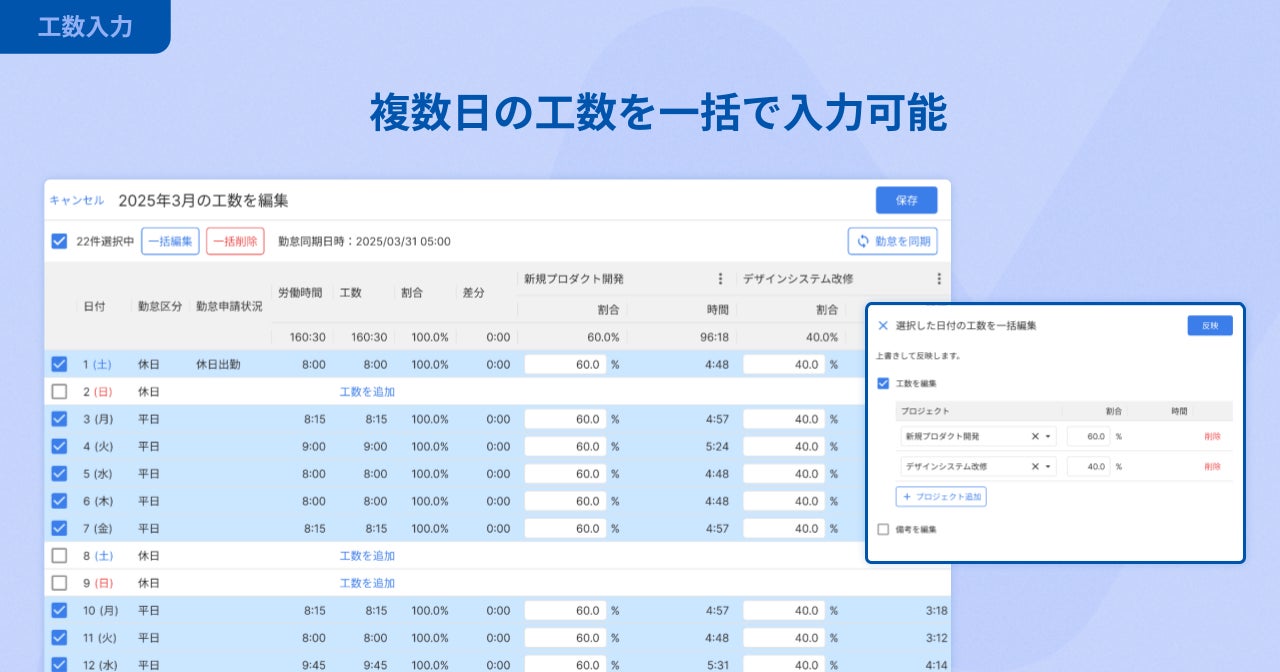 今回のプロダクト連携により、従業員は『マネーフォワード クラウド勤怠』の実際の労働時間のデータをもとに、プロジェクトごとの工数の割り振りを手間なく行うことができます。工数の割り振りは、時間単位だけでなくパーセンテージでも入力可能で※、直感的に操作できます。さらに、複数日の工数を一括で効率よく入力することも可能です。