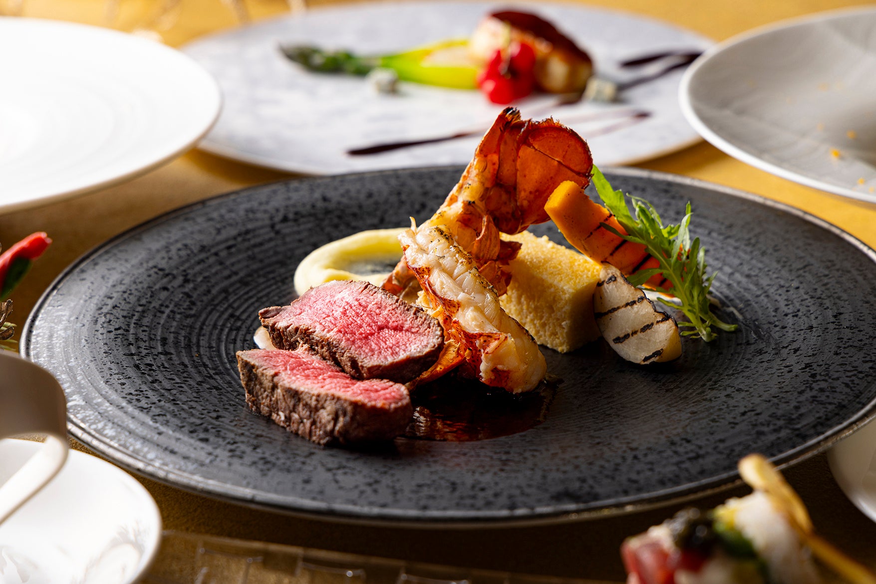 メニュー: 黒毛和牛ロインの網焼き イエローポレンタ 農園直送野菜 マデラソース トリュフ風味など全6品