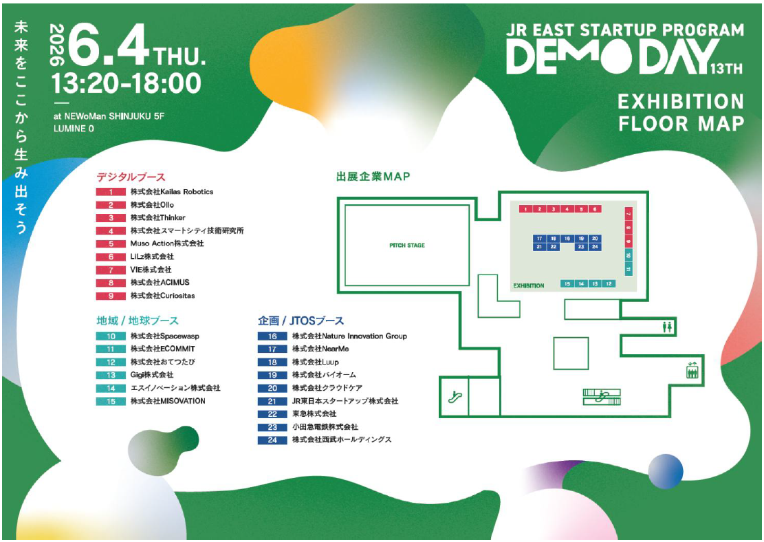 この度開催する「第13回JR東日本スタートアッププログラムDEMODAY」は、2025秋プログラムの採択企業が新たな共創プランを発表する「PITCH STAGE」(プレゼンテーション)、そして2025秋プログラムの採択企業に加えJTOS採択企業の事業共創の数々を展示・紹介する「EXHIBITION」(ブース展示)を催します。