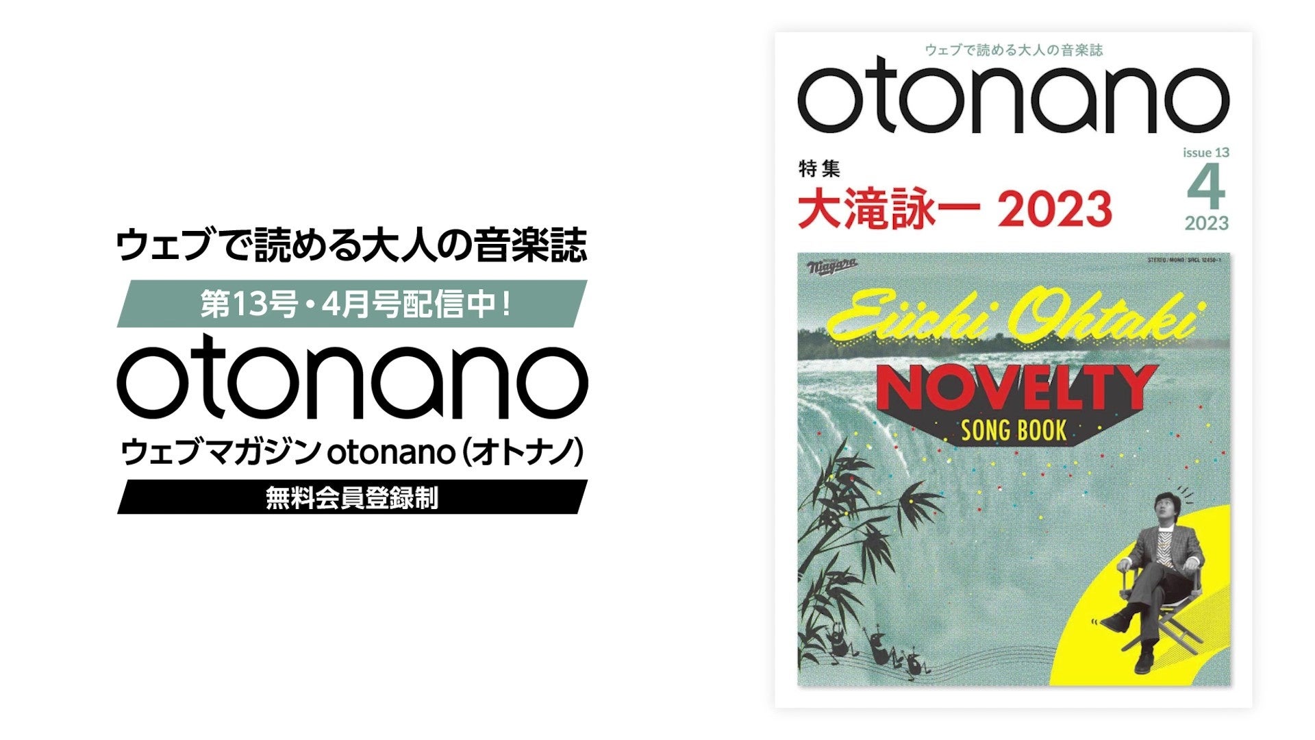 ウェブマガジン「otonano」は毎月ひとつの特集テーマを決め、 そのテーマに沿ってアーティストや関係者インタビュー、 著名人コラム、 作品徹底検証、 過去の音楽誌のアーカイブなど様々な記事を公開。 平日は毎日更新し、 月末にはウェブ上で一冊の音楽誌(ウェブマガジン)が完成する。 VOL.13=4月号の特集は「大滝詠一 2023」。話題のアルバム『大滝詠一NOVELTY SONG BOOK / NIAGARA ONDO BOOK』の発売を記念して、“日本ポップス界の巨人”大滝詠一のユーモア感覚あふれる多彩な音楽性の魅力にスポットを当て特集を組んだ。