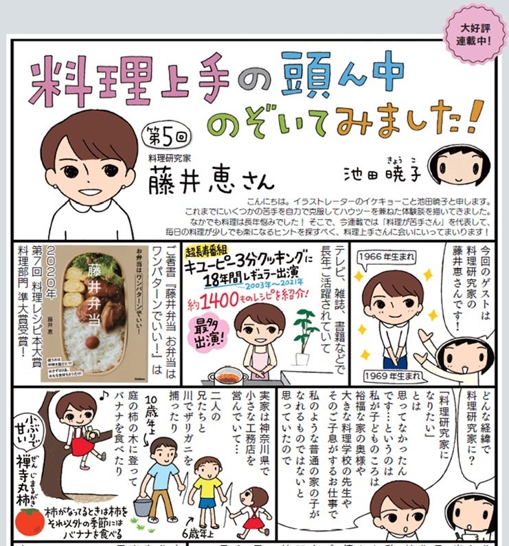 これまでにいくつかの苦手を自力で克服してハウツーを兼ねた体験談を描いてきた漫画家の池田暁子さんが、「料理が苦手さん」を代表して、毎日の料理が少しでも楽になるヒントを探すべく、料理上手さんに会いにいく人気連載。第5回は、料理研究家の藤井恵さんにお話を伺いました!