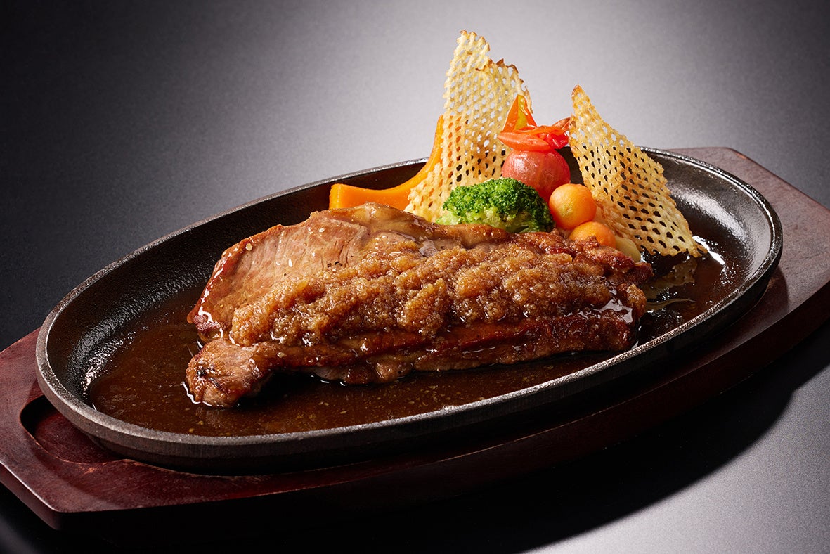 マルコポーロの人気メニュー。ジューシーなアメリカ産サーロインを鉄板で焼き上げ、和風おろしソースでさっぱりと仕上げました。