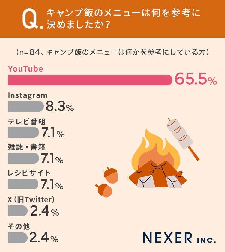 さらに何らかの媒体をキャンプ飯のメニューの参考にしていると回答した方の65.5%が「YouTubeを参考にしている」と回答しています。
