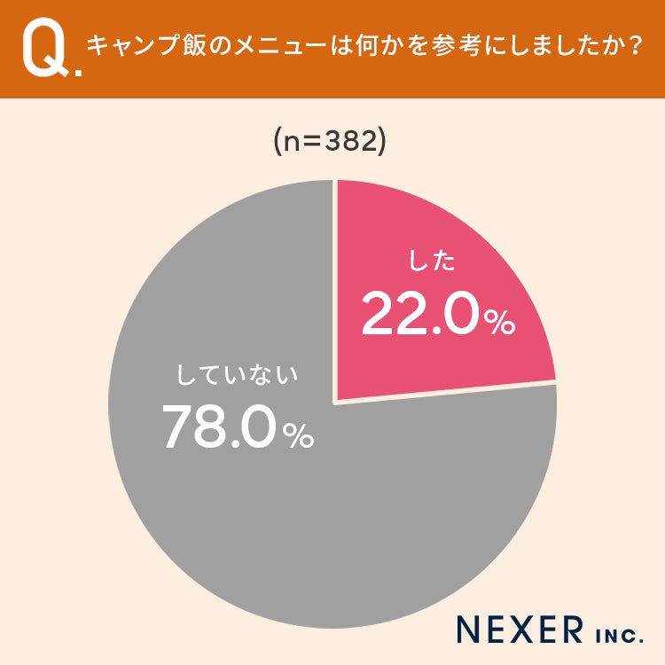 22%の方が、キャンプ飯のメニューは何か媒体を参考に「した」と回答しています。