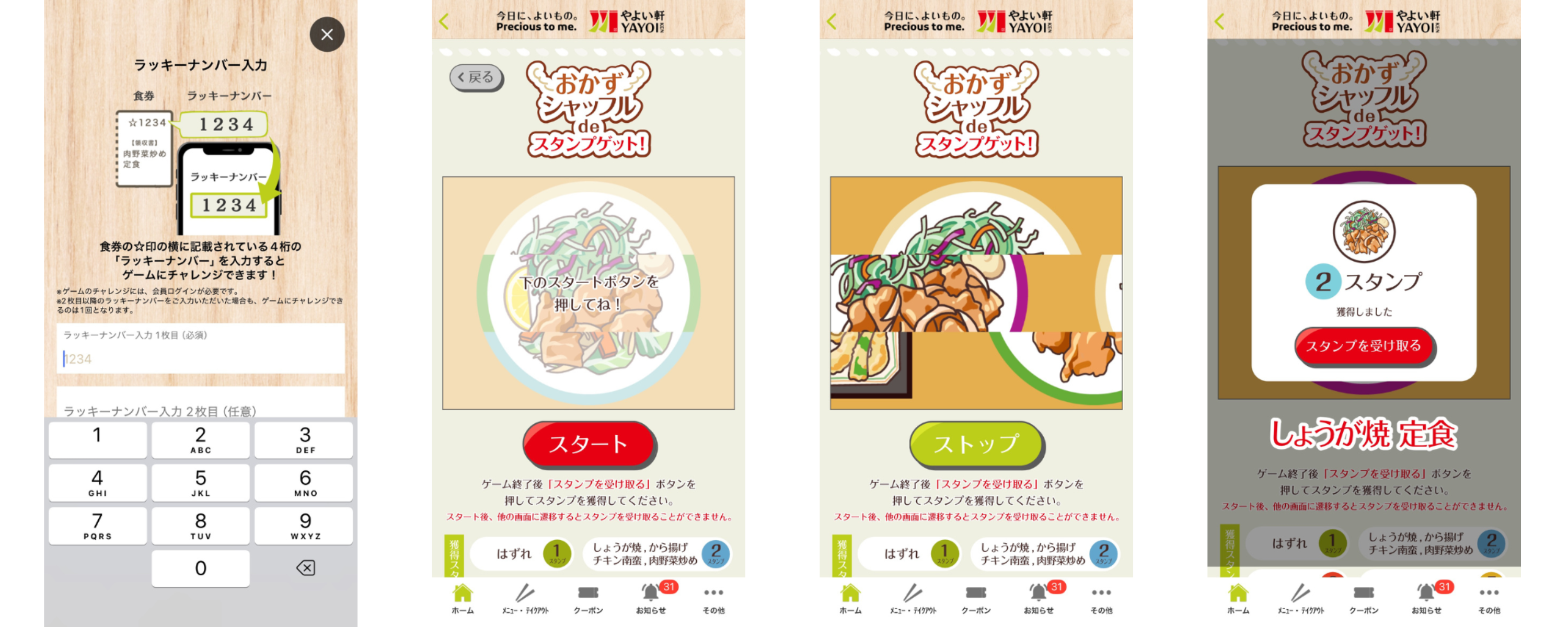 店舗へご来店時に食券に記載されているラッキーナンバーを、やよい軒公式アプリに入力してミニゲームに参加することで貰えるスタンプが、期間中2倍となります。