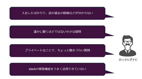 「おっさんずナビ」は、第三回目となる生成系AI勉強会内のLT大会にて、事業部とエンジニア(自称おっさんずの社員2名)がペアを組み、「入社したばかりで、話の過去の経緯などが分からない」、「誰かに聞くほどではない小さな疑問」、「プライベートなことで、ちょっと聞きづらい質問」、「Slackの検索機能をうまく活用できていない」などの現場の課題をどう解決できるか、アイデアを出し合って発案されたものです。